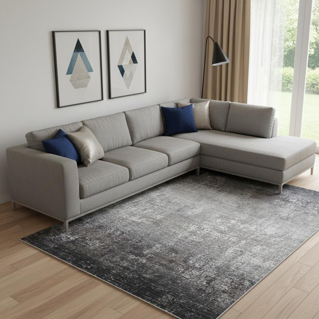Set an inviting tone in your space with this 10' x 13' gray black and silver abstract power loom distressed area rug with fringe. This rectangle shaped rug features a abstract design in gray black and silver to give it visual interest. A classic shape marries with good looking design for your space This superior Turkish rug represents the highest quality and is built to last. Tassel ends bring a timeless and fashionable look to your interior. Area Rugs help to give warmth and sense of home to your space. 0.32" H x 117" W x 158" D
