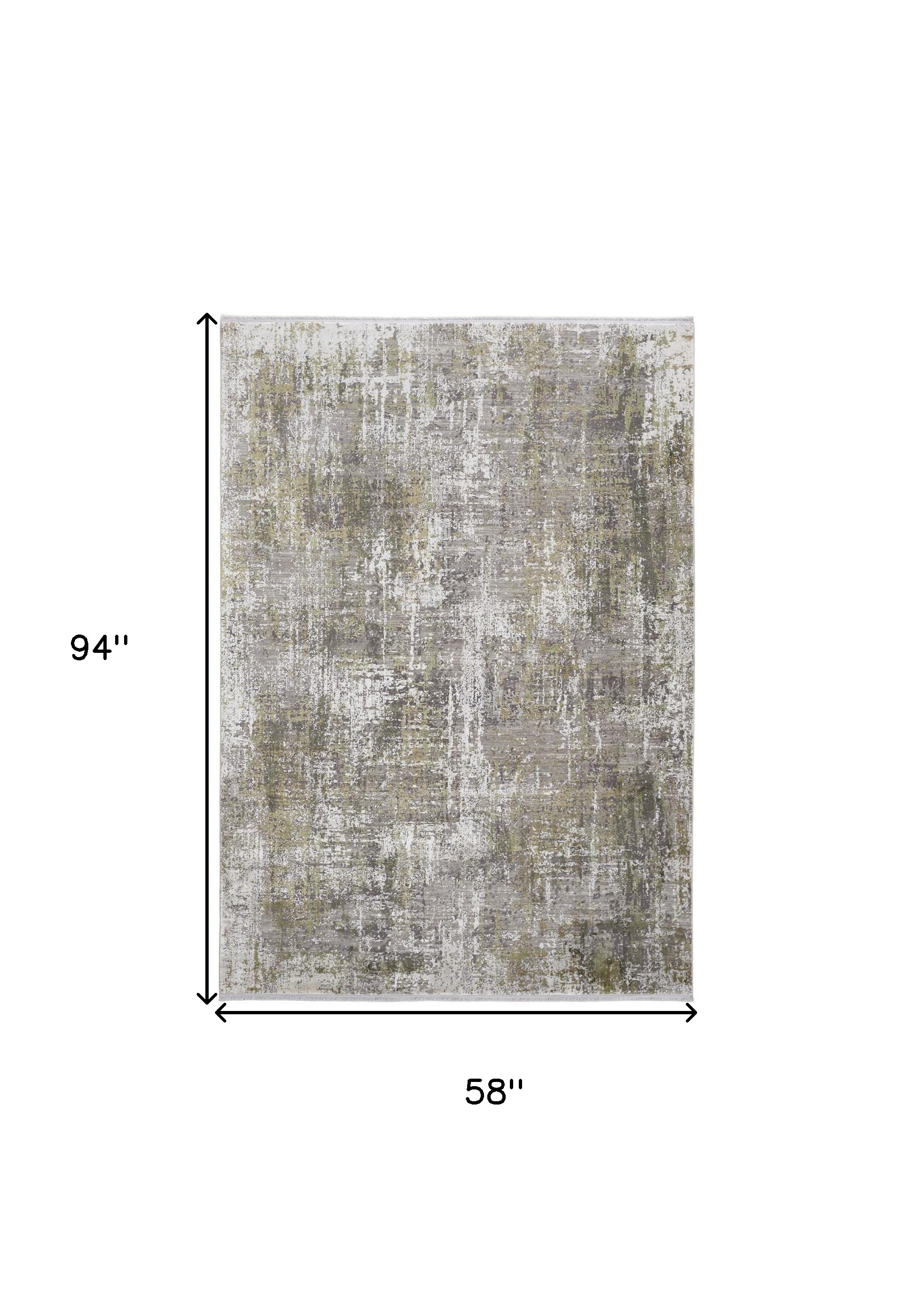 Add some artistry to your room with this 5' x 8' green gray and ivory abstract area rug with fringe. This rectangle shaped rug features a abstract design in green gray and ivory to give it visual interest. A classic shape marries with good looking design for your space This superior Turkish rug represents the highest quality and is built to last. Tassel ends bring a timeless and fashionable look to your interior. Area Rugs help to give warmth and sense of home to your space. 0.32" H x 58" W x 94" D