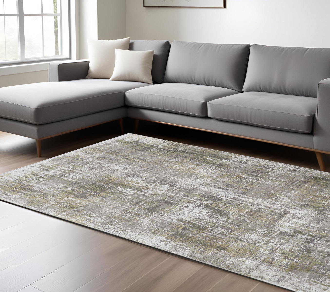 This 7-foot x 10-foot gray and ivory abstract non skid area rug with fringe, is a great way to add warmth to a room. This rectangle shaped rug features a abstract design in gray and ivory to give it visual interest. A classic shape marries with good looking design for your space tassel ends bring a timeless and fashionable look to your interior. 78-inch H x 114-inch W x 0.32-inch D