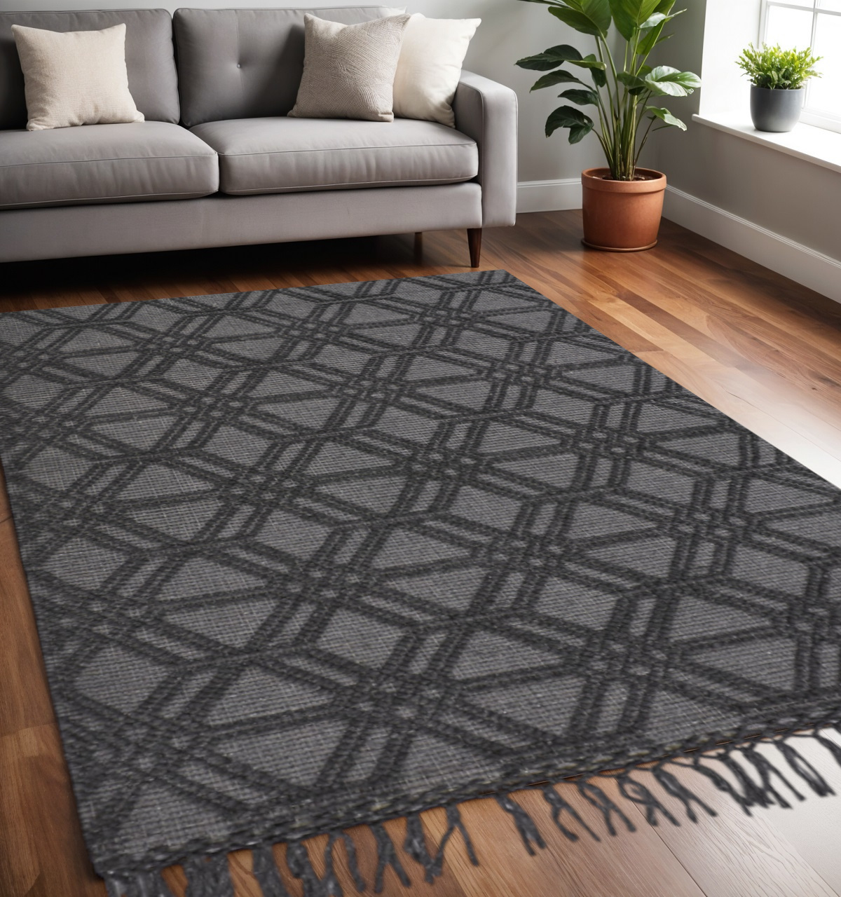Set an inviting tone in your space with this 5-foot x 8-foot black and gray wool geometric hand woven area rug with fringe. This rectangle shaped rug features a geometric design in black and gray to give it visual interest. A classic shape marries with good looking design for your space tassel ends bring a timeless and fashionable look to your interior. Crafted by skilled artisans, this hand woven rug is genuine and unique. No two will be exactly alike. 60-inch H x 90-inch W x 0.47-inch D