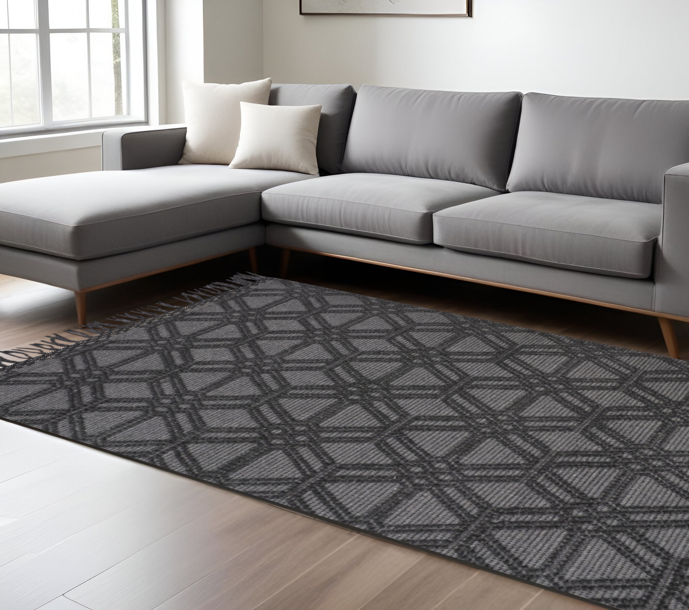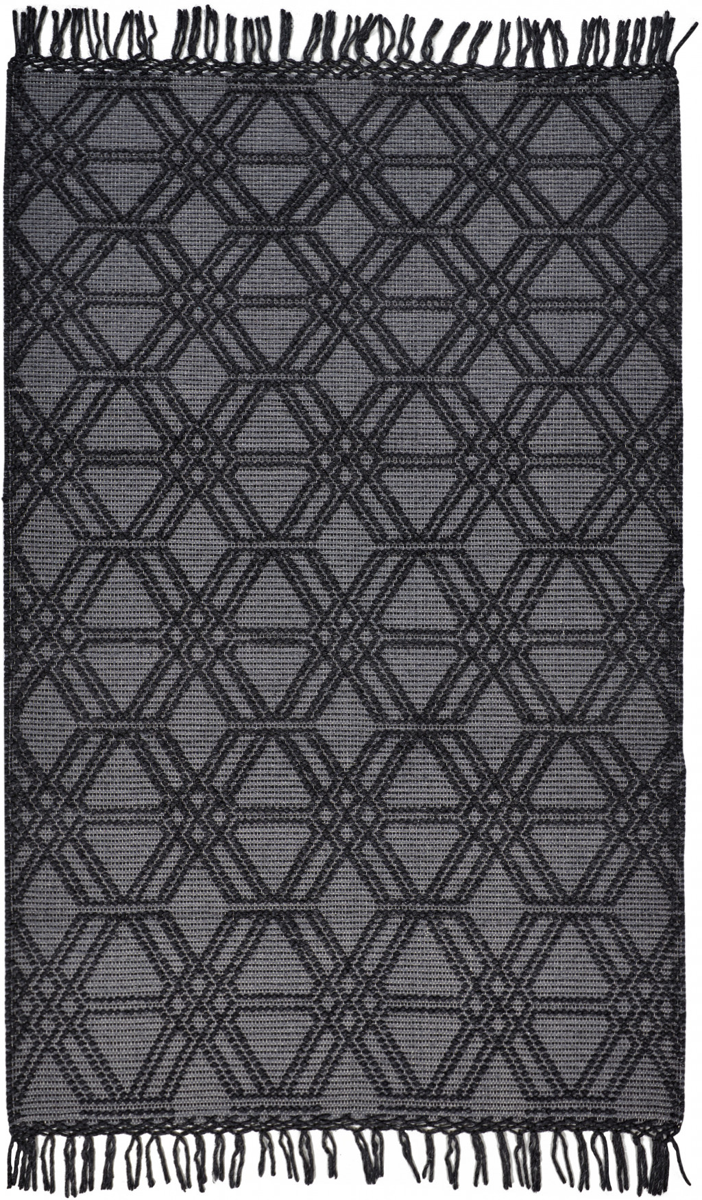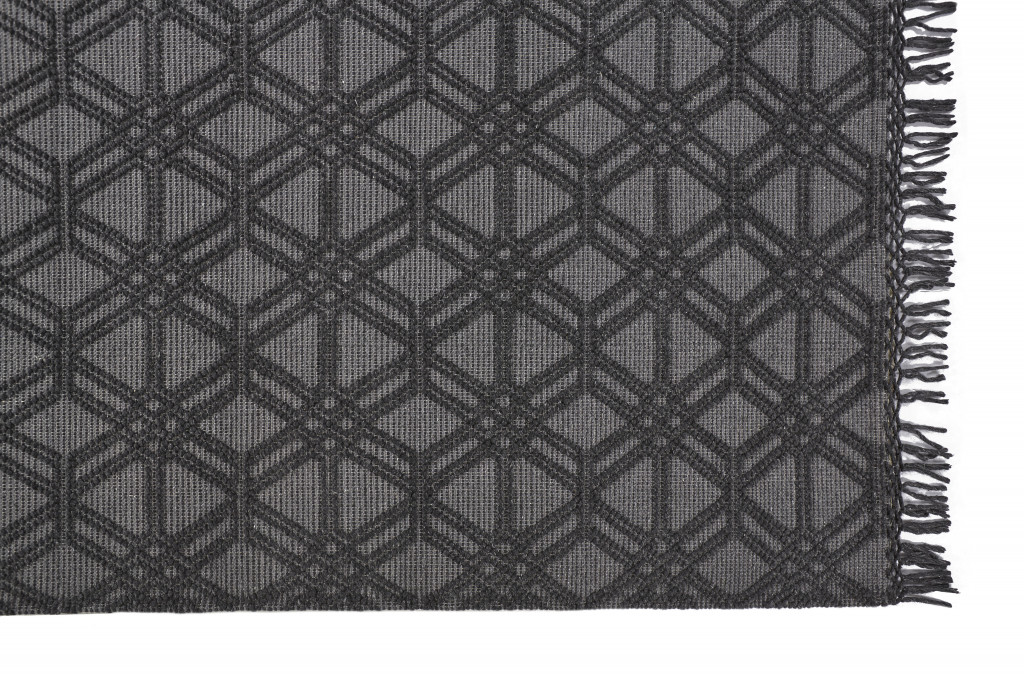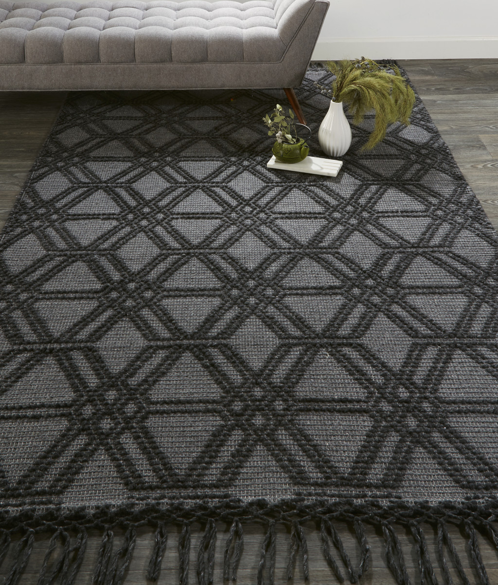 This 8-foot x 10-foot black and gray wool geometric hand woven area rug with fringe, is a great way to add warmth to a room. This rectangle shaped rug features a geometric design in black and gray to give it visual interest. A classic shape marries with good looking design for your space tassel ends bring a timeless and fashionable look to your interior. Crafted by skilled artisans, this hand woven rug is genuine and unique. No two will be exactly alike. 93-inch H x 117-inch W x 0.47-inch D