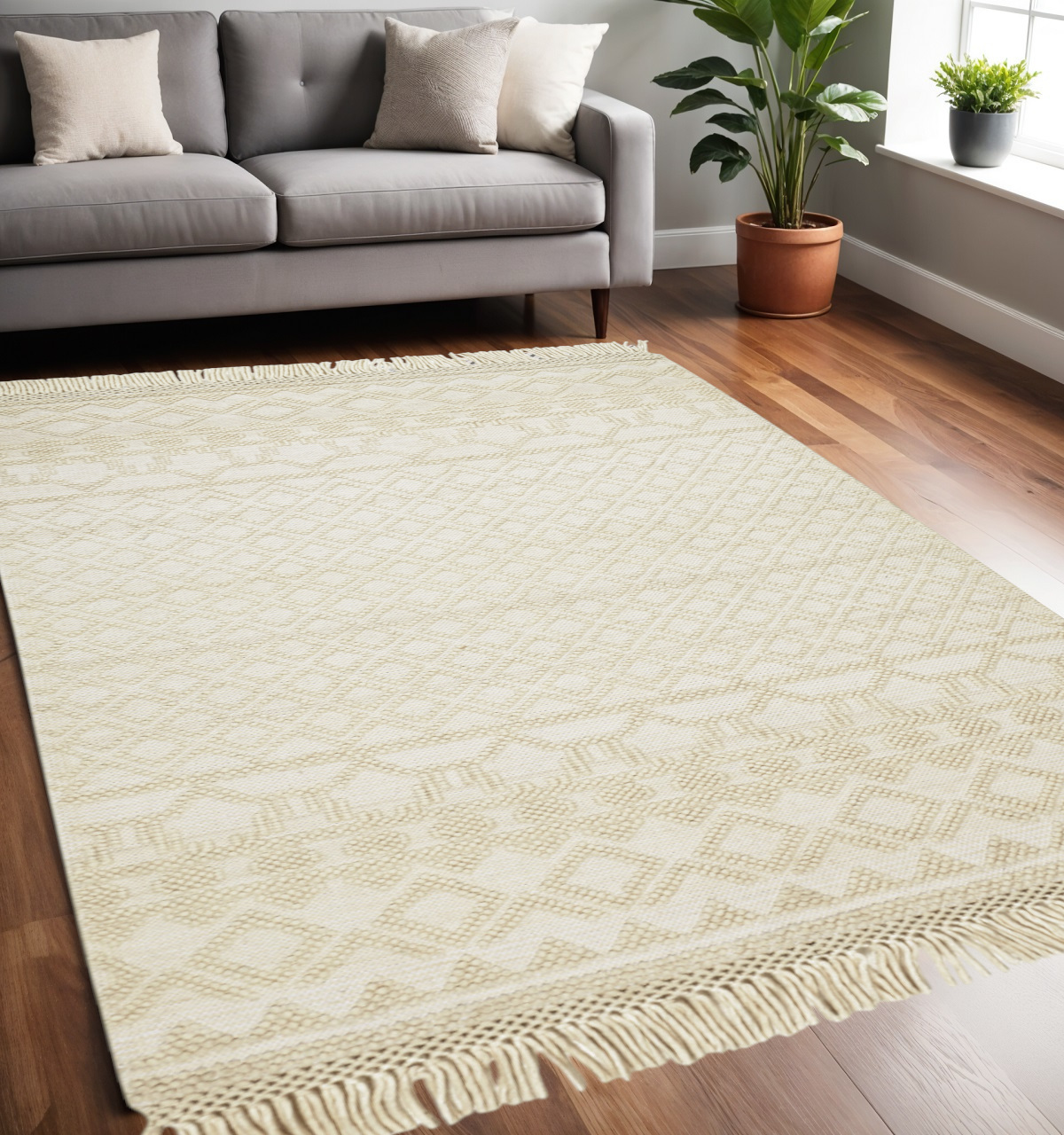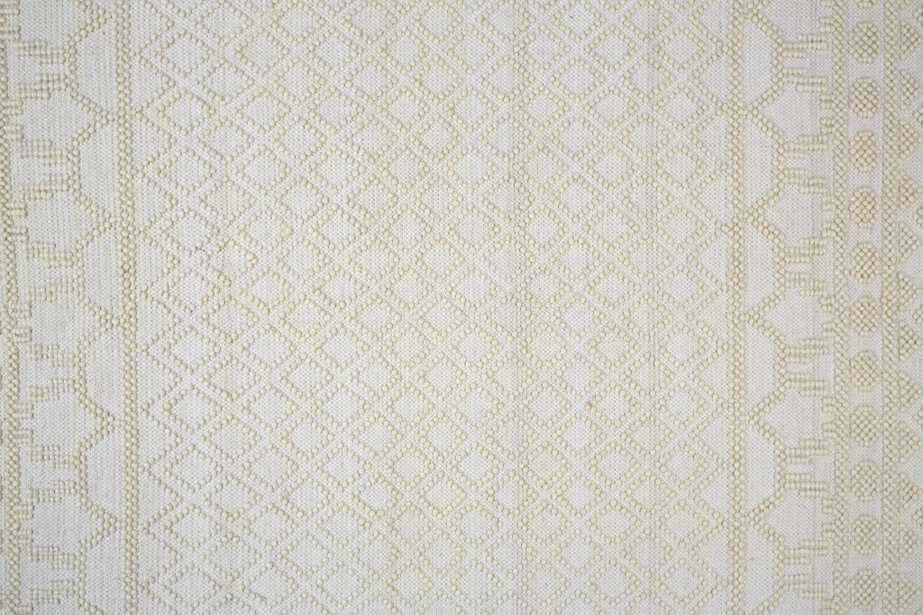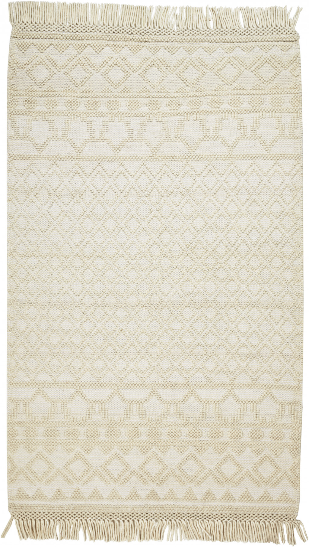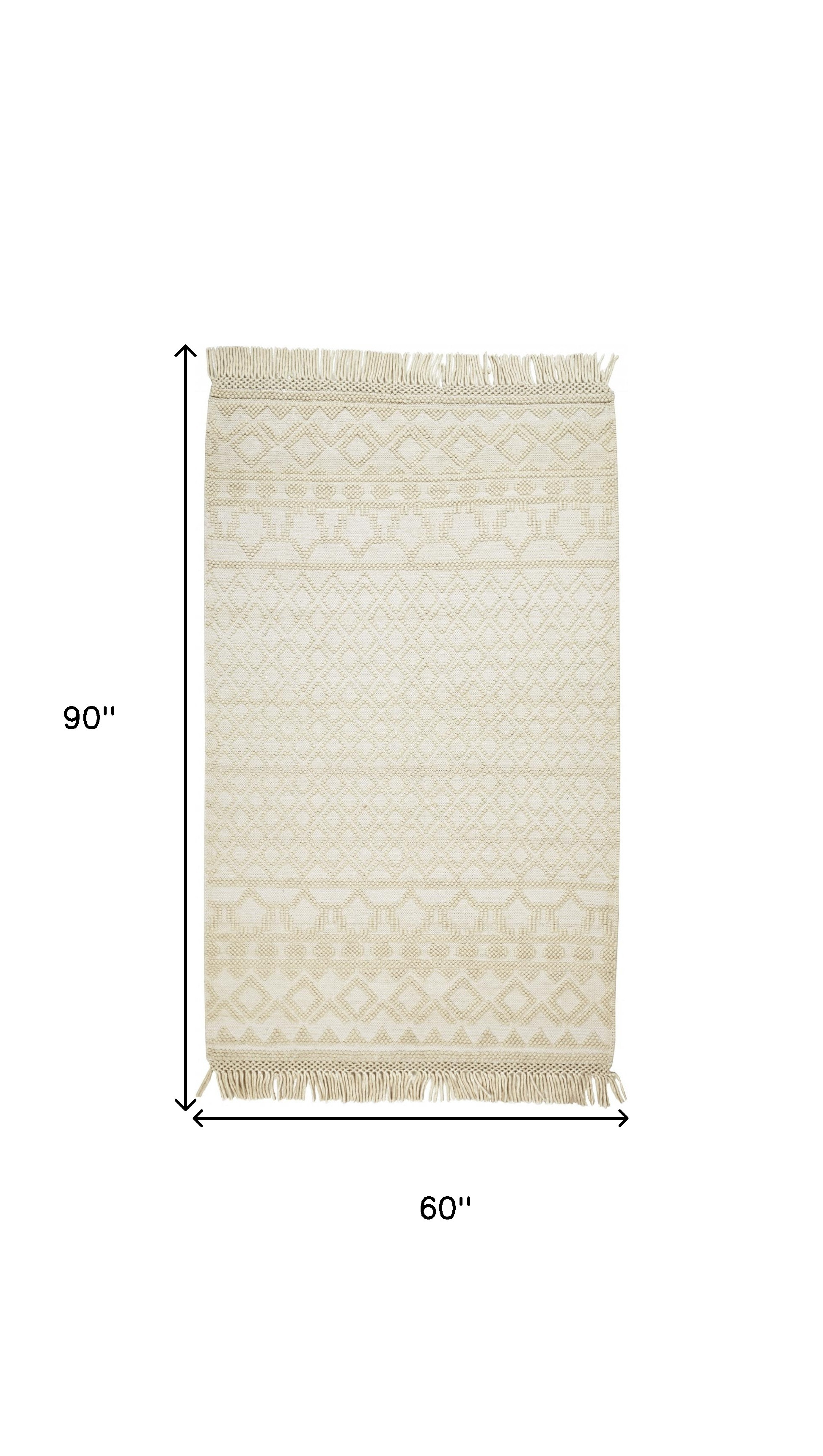 Add great coloration and comfortable texture to your space with this 5-foot x 8-foot ivory wool geometric hand woven area rug with fringe. This rectangle shaped rug features a geometric design in ivory to give it visual interest. A classic shape marries with good looking design for your space the coloring of this rug adds a delightfully neutral tone to your home and will easily match with most any decor. Tassel ends bring a timeless and fashionable look to your interior. Crafted by skilled artisans, this hand woven rug is genuine and unique. No two will be exactly alike. 60-inch H x 90-inch W x 0.47-inch D