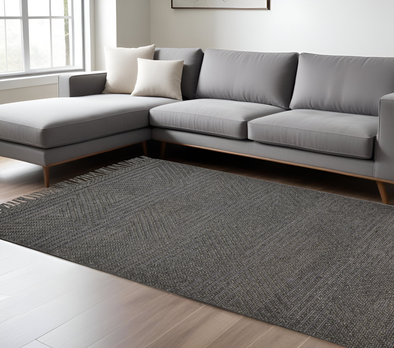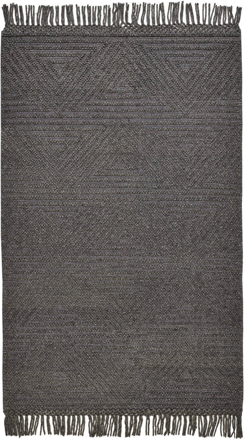 Set an inviting tone in your space with this 8-foot x 10-foot gray wool geometric hand woven area rug with fringe. This rectangle shaped rug features a geometric design in gray to give it visual interest. A classic shape marries with good looking design for your space the coloring of this rug adds a delightfully neutral tone to your home and will easily match with most any decor. Tassel ends bring a timeless and fashionable look to your interior. Crafted by skilled artisans, this hand woven rug is genuine and unique. No two will be exactly alike. 93-inch H x 117-inch W x 0.47-inch D