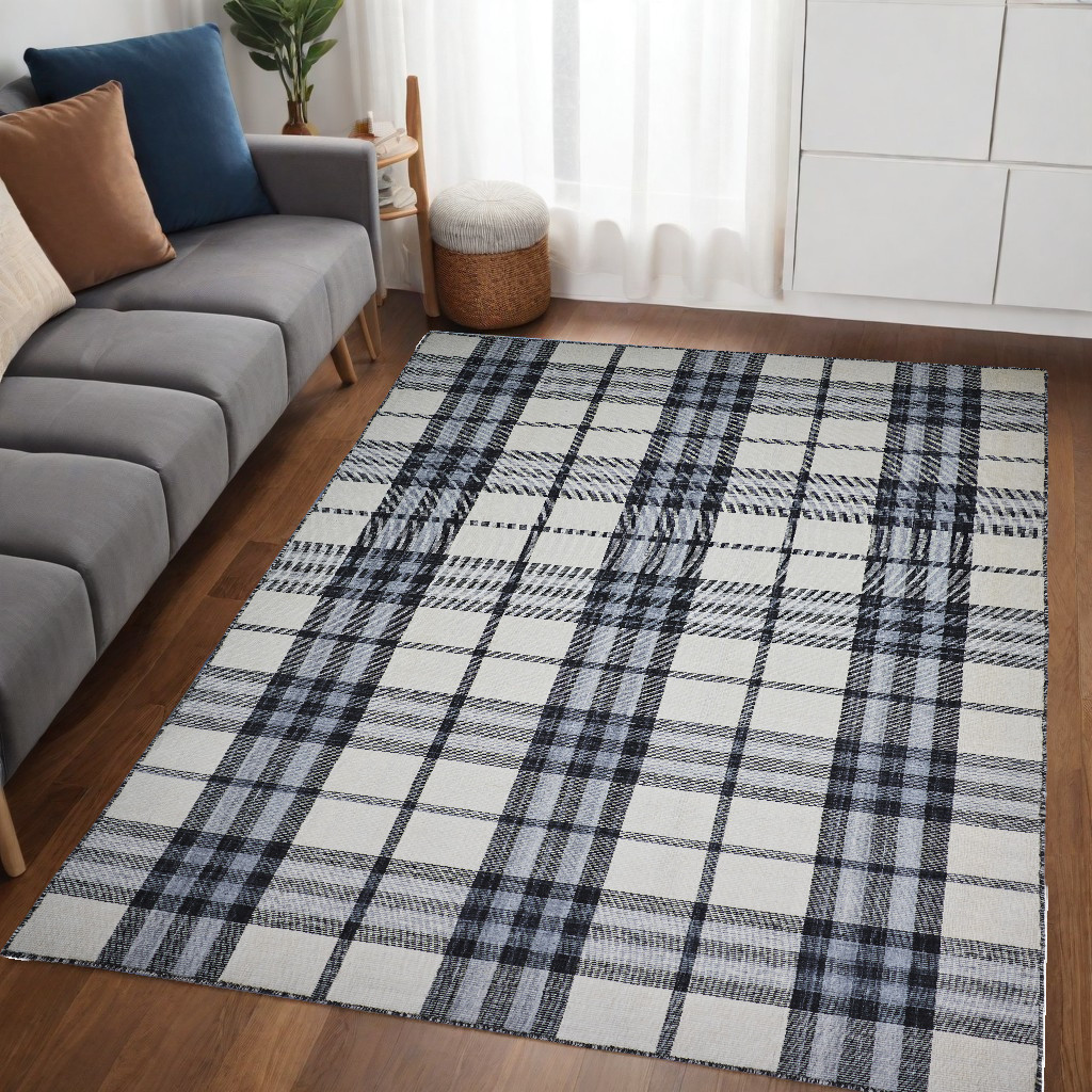 Set an inviting tone in your space with this 5' x 8' ivory blue and black abstract hand woven stain resistant area rug. This rectangle shaped rug features a abstract design in ivory blue and black to give it visual interest. A classic shape marries with good looking design for your space Ideal for spaces with kids and pets, this rug is stain resistant to help repel stains and spilled liquids. Crafted by skilled artisans, this hand woven rug is genuine and unique. No two will be exactly alike. Area Rugs help to give warmth and sense of home to your space. 0.16" H x 60" W x 96" D
