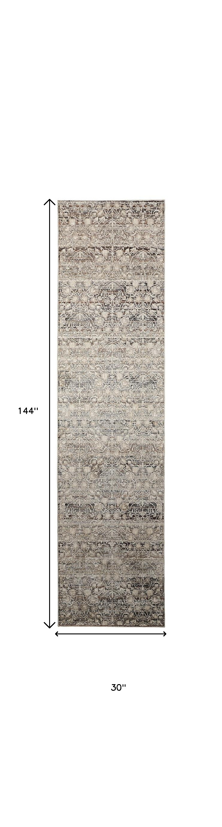 Add some artistry to your room with this 12-foot gray and ivory oriental power loom distressed runner rug with fringe. This runner shaped rug features a oriental design that will add a functional and decorative accent to your space. Tassel ends bring a timeless and fashionable look to your interior. This smaller sized rug is just what you need for your walkway, or in front of door, cabinet, refrigerator, or chair. 30-inch h x 144-inch w x 0.39-inch d