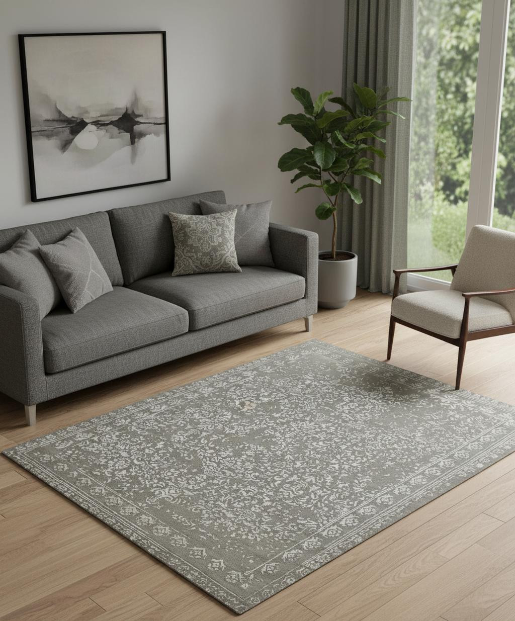 tufted handmade distressed area rug, handmade distressed area rug, distressed area rug, wool floral tufted handmade distressed, gray taupe silver wool floral |