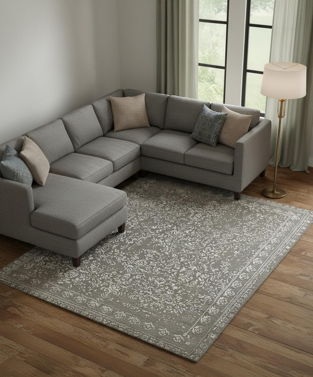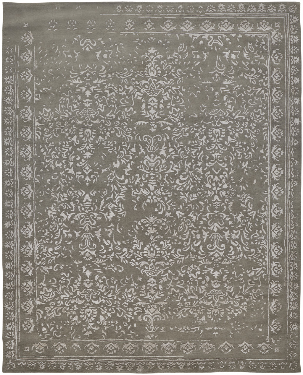 tufted handmade distressed area rug, handmade distressed area rug, distressed area rug, gray taupe silver wool floral, wool floral tufted handmade distressed |