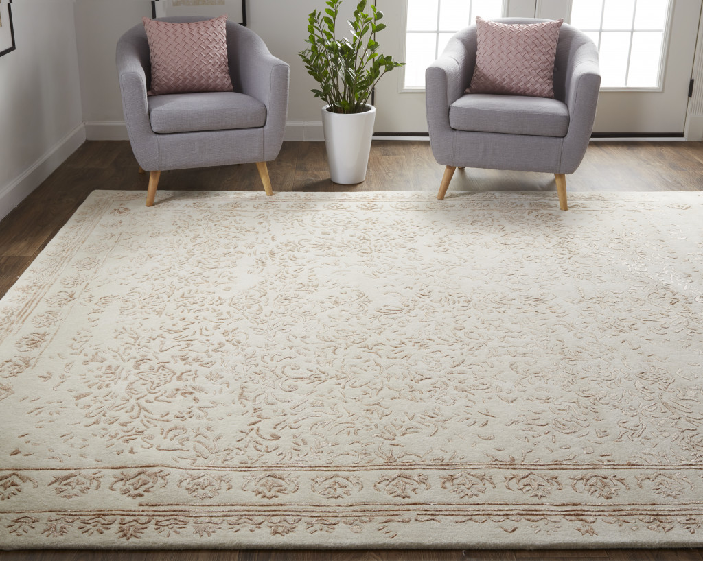 Set an inviting tone in your space with this 9' x 12' ivory tan and pink wool floral tufted handmade distressed area rug. This rectangle shaped rug features a floral design in ivory tan and pink to give it visual interest. A classic shape marries with good looking design for your space Place this area rug against a hardwood or tile floor and it will enliven your living space with style and sophistication. 0.31" H x 108" W x 144" D