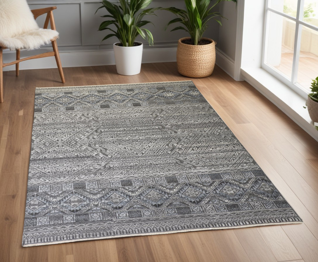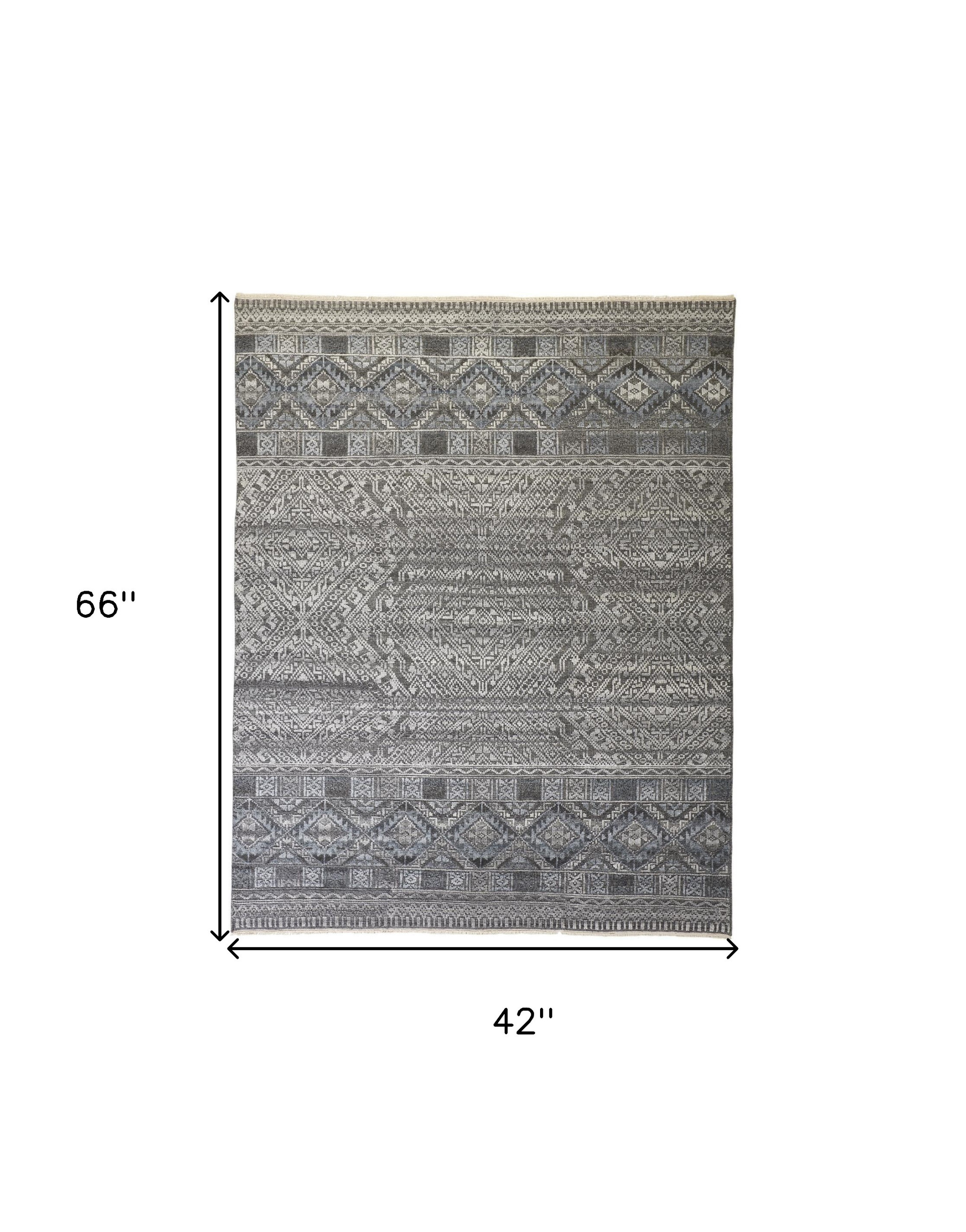 Add great coloration and comfortable texture to your space with this 4-foot x 6-foot gray and ivory geometric hand knotted area rug. This rectangle shaped rug features a geometric design in gray and ivory to give it visual interest. A classic shape marries with good looking design for your space crafted by skilled artisans, this hand knotted rug is genuine and unique. No two will be exactly alike. 42-inch H x 66-inch W x 0.31-inch D