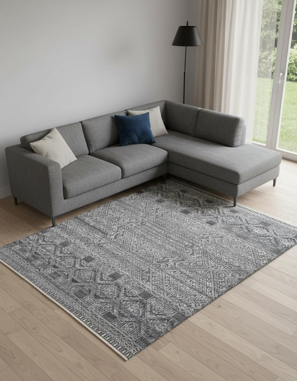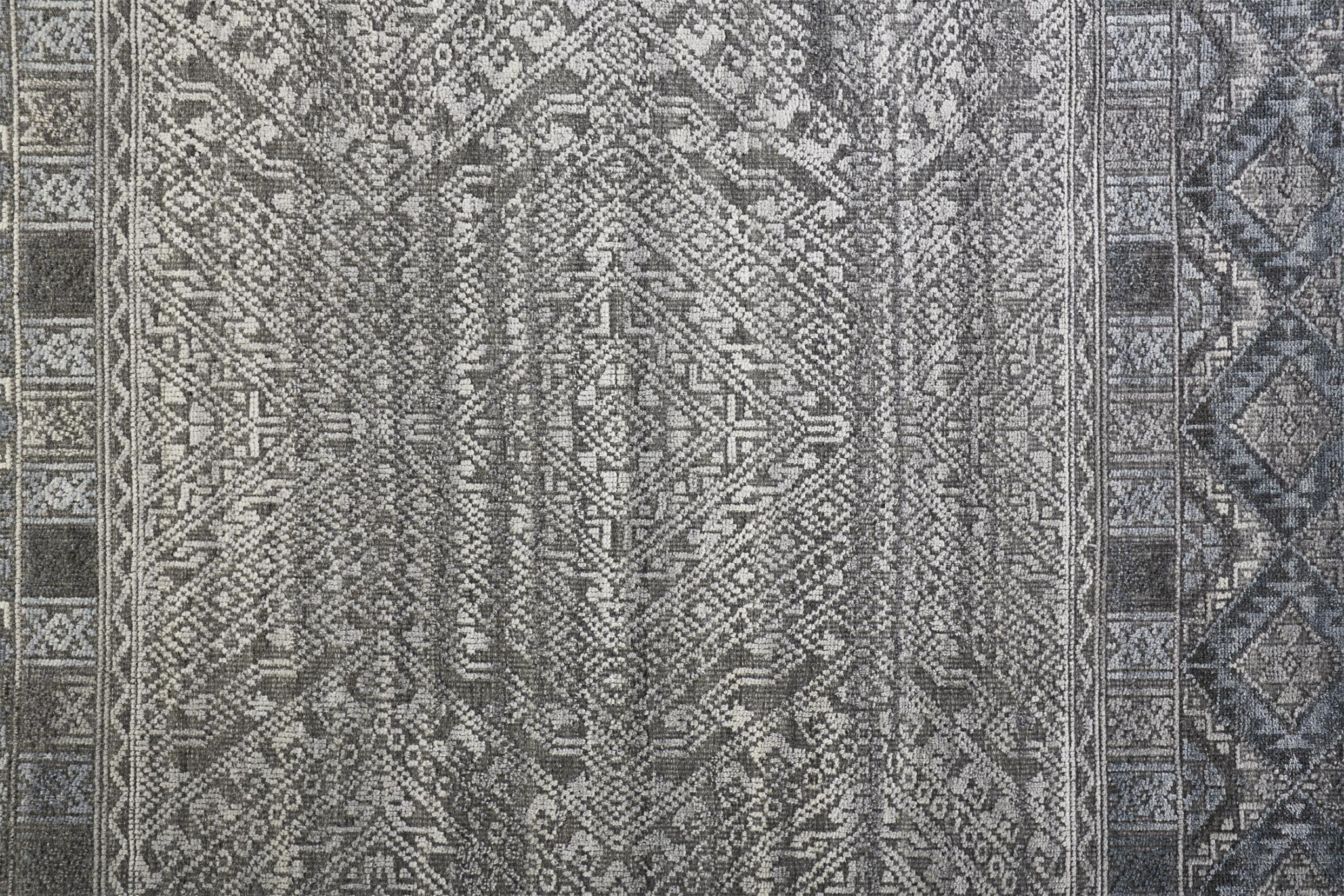 Add great coloration and comfortable texture to your space with this 8' x 10' gray ivory and blue geometric hand knotted area rug. This rectangle shaped rug features a geometric design in gray ivory and blue to give it visual interest. A classic shape marries with good looking design for your space Crafted by skilled artisans, this hand knotted rug is genuine and unique. No two will be exactly alike. Place this area rug against a hardwood or tile floor and it will enliven your living space with style and sophistication. 0.31" H x 93" W x 117" D