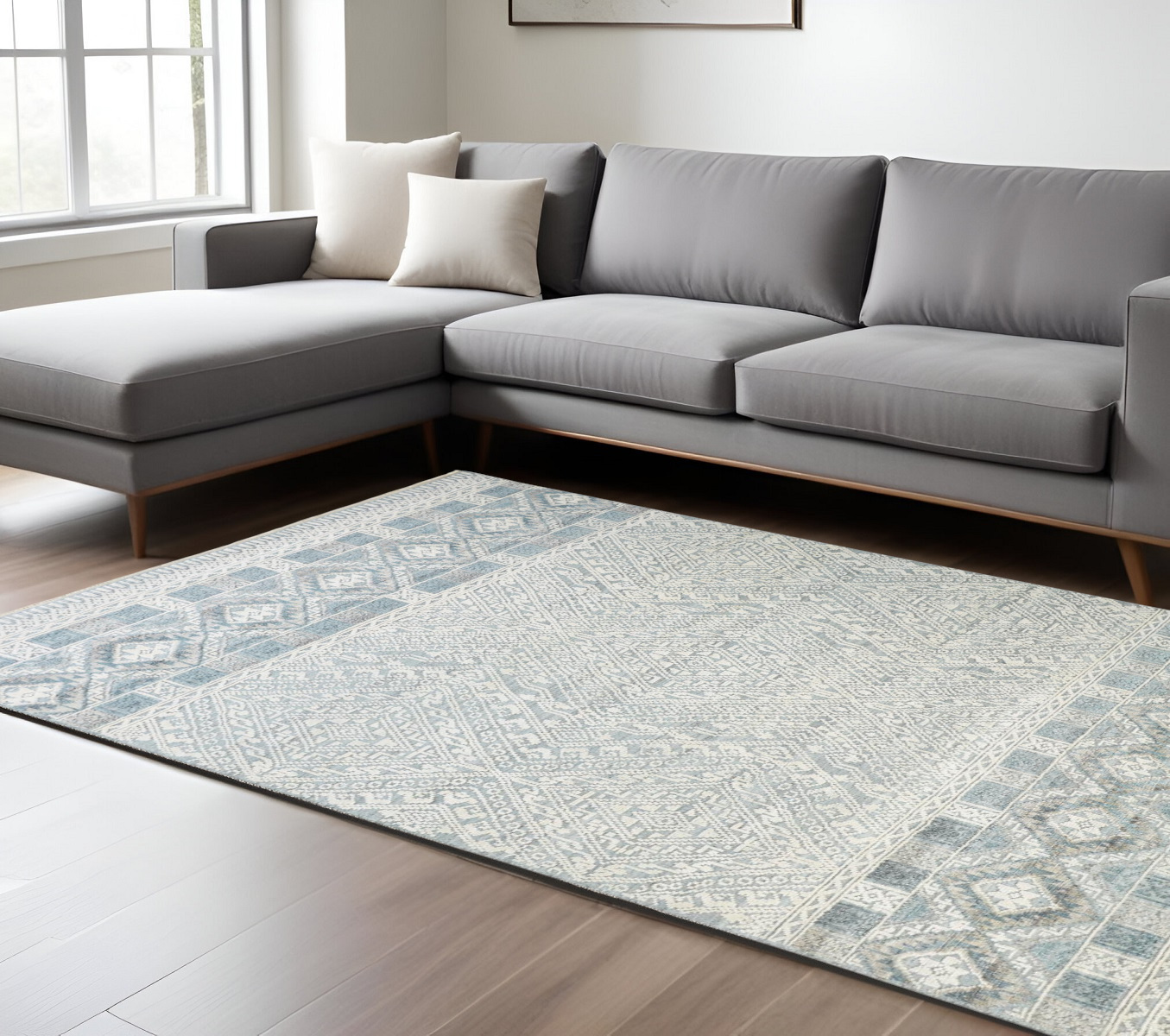 Add great coloration and comfortable texture to your space with this 10-foot x 13-foot ivory and blue geometric hand knotted area rug. This rectangle shaped rug features a geometric design in ivory and blue to give it visual interest. A classic shape marries with good looking design for your space crafted by skilled artisans, this hand knotted rug is genuine and unique. No two will be exactly alike. 114-inch H x 162-inch W x 0.31-inch D