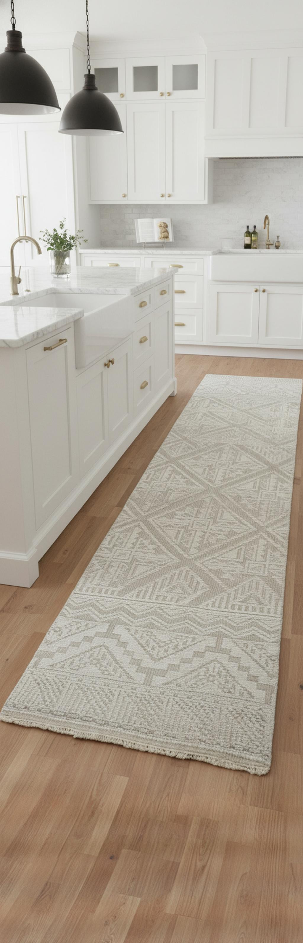 Add some artistry to your room with this 8' ivory tan and gray geometric hand knotted runner rug. This runner shaped rug features a geometric design in ivory tan and gray to give it visual interest. A classic shape marries with good looking design for your space Crafted by skilled artisans, this hand knotted rug is genuine and unique. No two will be exactly alike. Area Rugs help to give warmth and sense of home to your space. 0.31" H x 30" W x 96" D