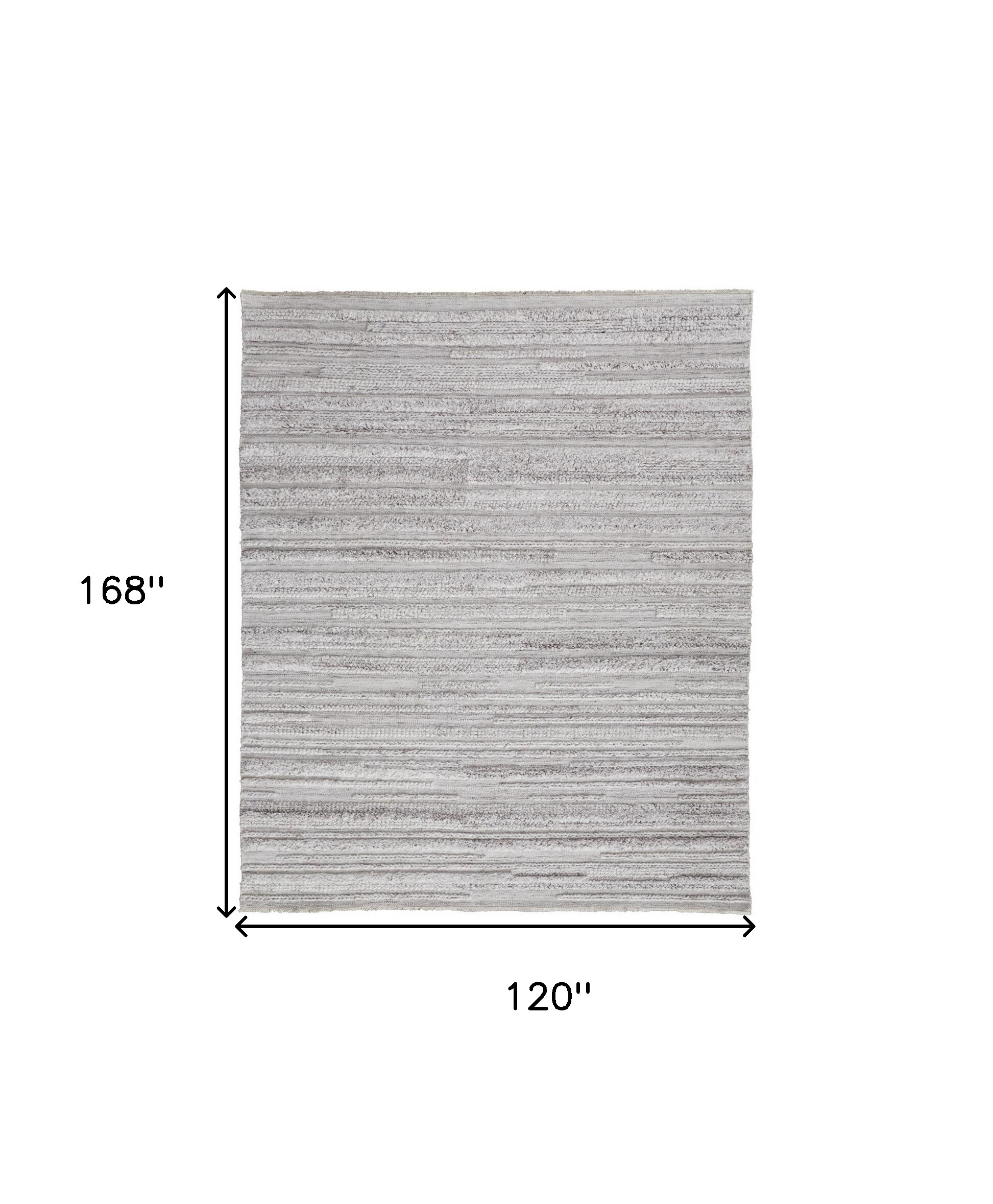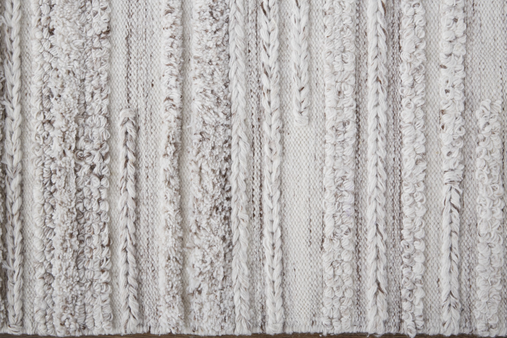 This 10-foot x 14-foot ivory and gray striped shag hand woven area rug, is a great way to add warmth to a room. This rectangle shaped rug features a striped design in ivory and gray to give it visual interest. A classic shape marries with good looking design for your space ideal for spaces with kids and pets, this rug is stain resistant to help repel stains and spilled liquids. Crafted by skilled artisans, this hand woven rug is genuine and unique. No two will be exactly alike. The retro shag construction of this luxurious rug will provide a soft and comfortable barrier to color tile and hardwood floors. Place this area rug against a hardwood or tile floor and it will enliven your living space with style and sophistication. 120-inch H x 168-inch W x 1-inch D