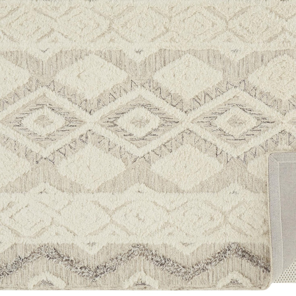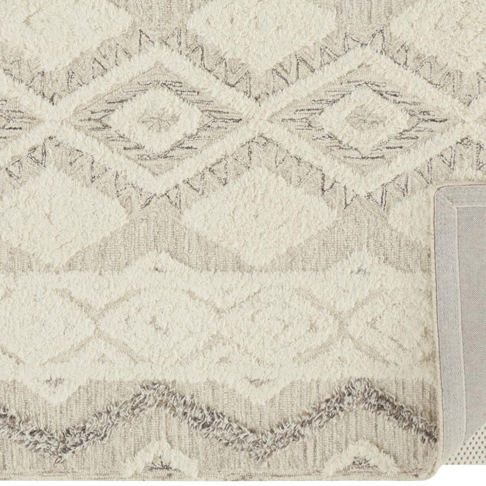 Add great coloration and comfortable texture to your space with this 2' x 3' ivory taupe and gray wool geometric tufted handmade stain resistant area rug. This rectangle shaped rug features a geometric design in ivory taupe and gray to give it visual interest. A classic shape marries with good looking design for your space Ideal for spaces with kids and pets, this rug is stain resistant to help repel stains and spilled liquids. Place this area rug against a hardwood or tile floor and it will enliven your living space with style and sophistication. 0.5" H x 24" W x 36" D