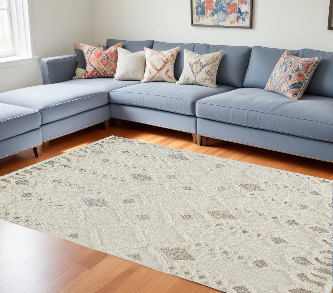 Set an inviting tone in your space with this 10' x 14' ivory tan and silver wool geometric tufted handmade stain resistant area rug. This rectangle shaped rug features a geometric design in ivory tan and silver to give it visual interest. A classic shape marries with good looking design for your space Ideal for spaces with kids and pets, this rug is stain resistant to help repel stains and spilled liquids. Area Rugs help to give warmth and sense of home to your space. 0.5" H x 120" W x 168" D