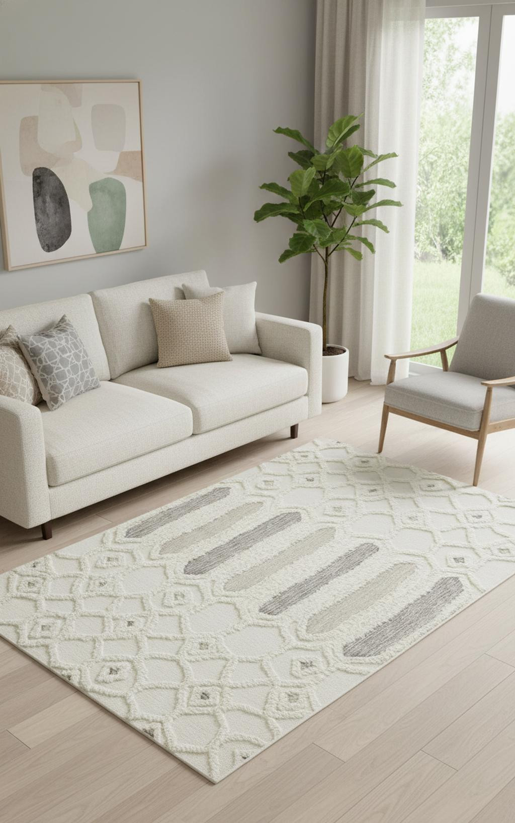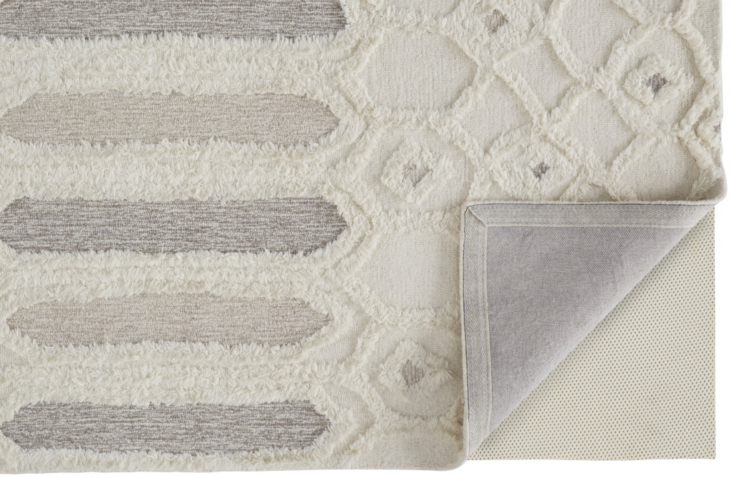 Add great coloration and comfortable texture to your space with this 5' x 8' ivory taupe and tan wool geometric tufted handmade stain resistant area rug. This rectangle shaped rug features a geometric design in ivory taupe and tan to give it visual interest. A classic shape marries with good looking design for your space Ideal for spaces with kids and pets, this rug is stain resistant to help repel stains and spilled liquids. Area Rugs help to give warmth and sense of home to your space. 0.5" H x 60" W x 96" D