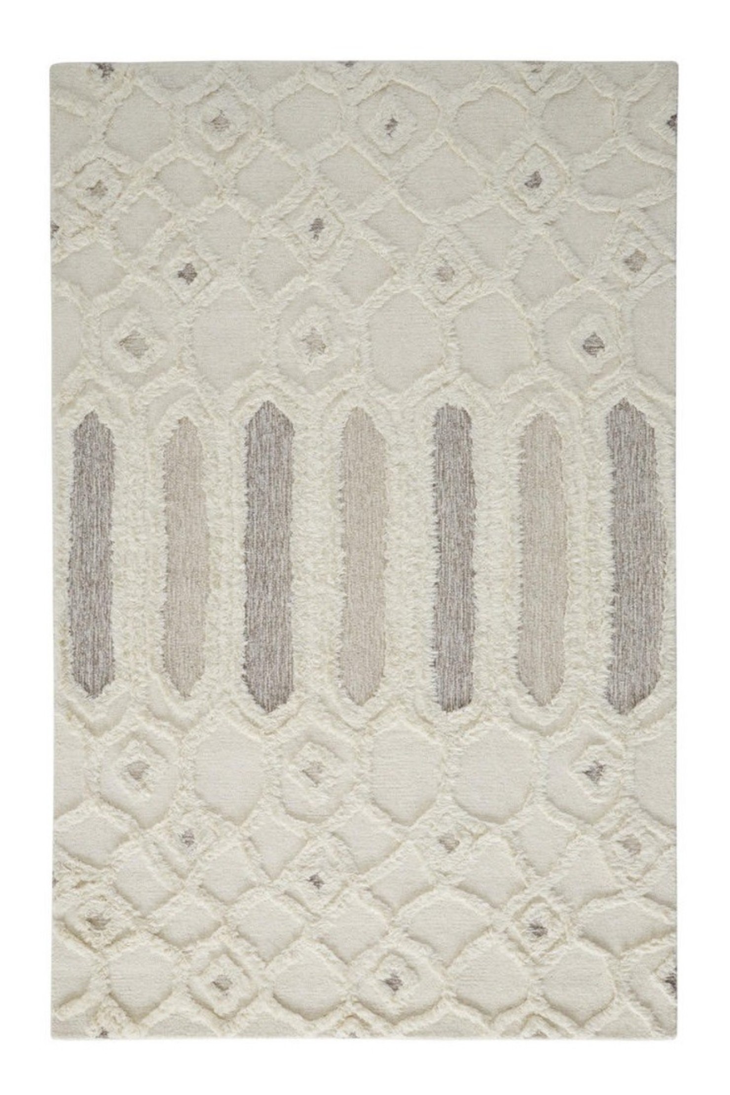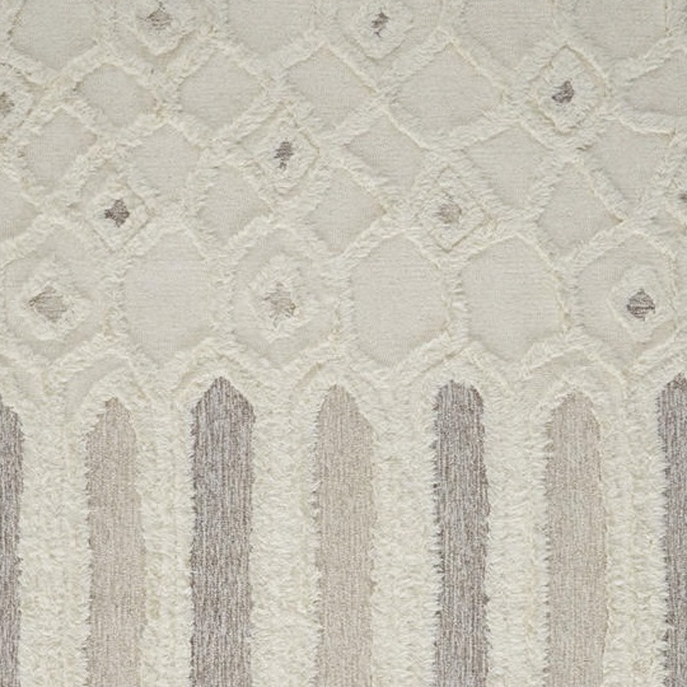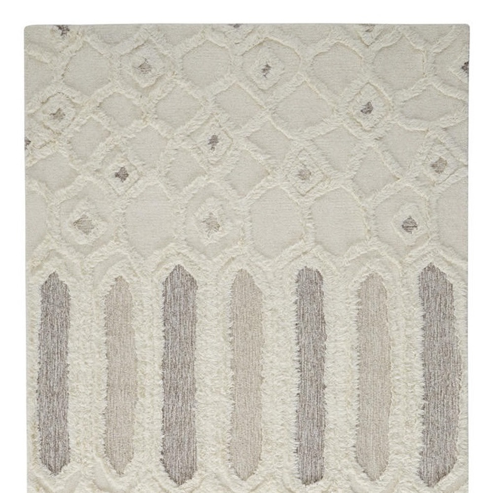 Set an inviting tone in your space with this 10' x 14' ivory taupe and tan wool geometric tufted handmade stain resistant area rug. This rectangle shaped rug features a geometric design in ivory taupe and tan to give it visual interest. A classic shape marries with good looking design for your space Ideal for spaces with kids and pets, this rug is stain resistant to help repel stains and spilled liquids. Area Rugs help to give warmth and sense of home to your space. 0.5" H x 120" W x 168" D