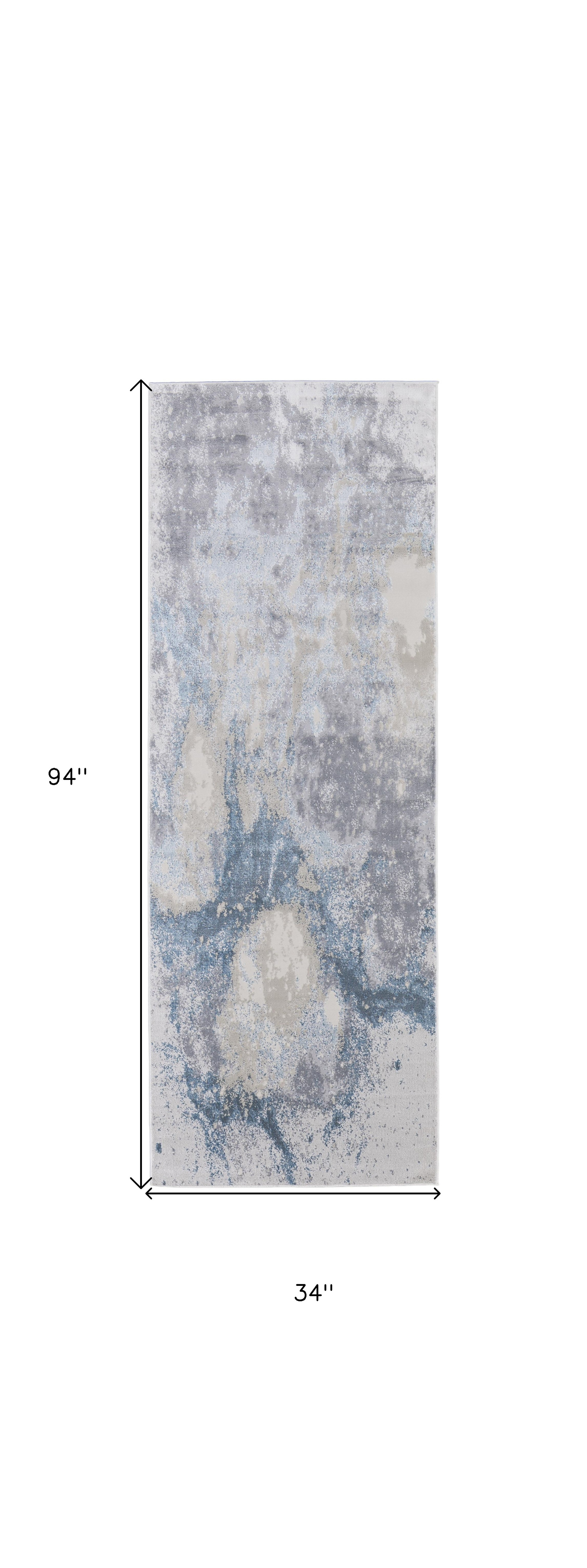 Add great coloration and comfortable texture to your space with this 8-foot ivory blue and gray abstract runner rug. Ideal for spaces with kids and pets, this rug is stain resistant to help repel dirt and spilled liquids. Built to last, this rug crafted from polyester fibers is known for its durability and long lasting appeal. Rugs are a great way to showcase your style, hide imperfections, warm your home and reduce noise. This industrial style runner makes a great accent for the hallway, in front of cabinets, in the laundry room, or any other space you need a narrow and long rug. 34.00-inch h x 94.00-inch w x 0.39-inch d.