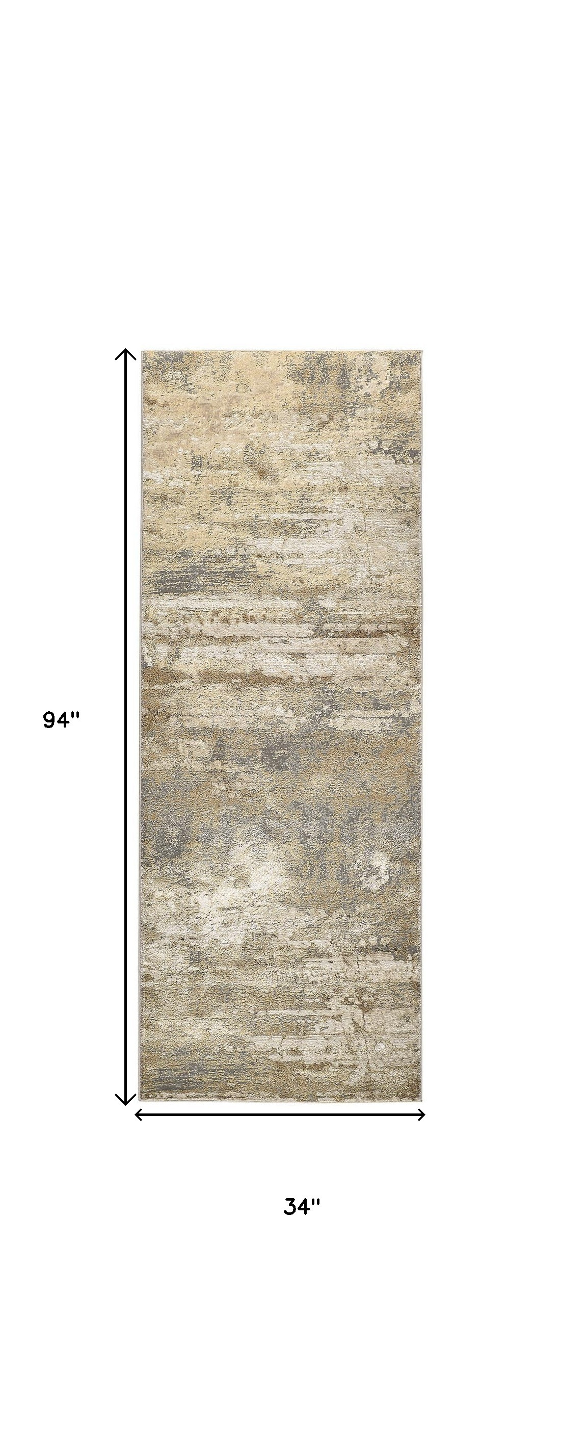 Add great coloration and comfortable texture to your space with this 8-foot gold and ivory abstract power loom runner rug. This runner shaped rug features a abstract design that will add a functional and decorative accent to your space. Ideal for spaces with kids and pets, this rug is stain resistant to help repel dirt and spilled liquids. This smaller sized rug is just what you need for your walkway, or in front of door, cabinet, refrigerator, or chair. 34-inch h x 94-inch w x 0.39-inch d