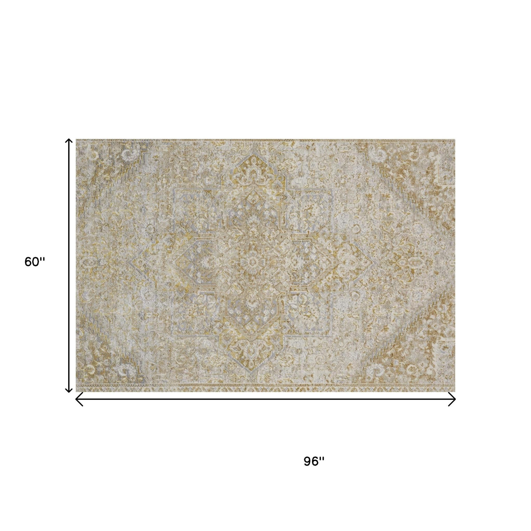 Add some artistry to your room with this 5-foot x 8-foot gold and ivory floral medallion area rug. Ideal for spaces with kids and pets, this rug is stain resistant to help repel dirt and spilled liquids. Built to last, this rug crafted from polyester fibers is known for its durability and long lasting appeal. Rugs are a great way to showcase your style, hide imperfections, warm your home and reduce noise. 60.00-inch h x 96.00-inch w x 0.39-inch d.