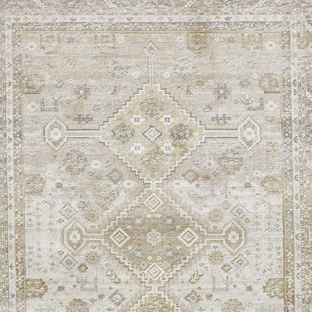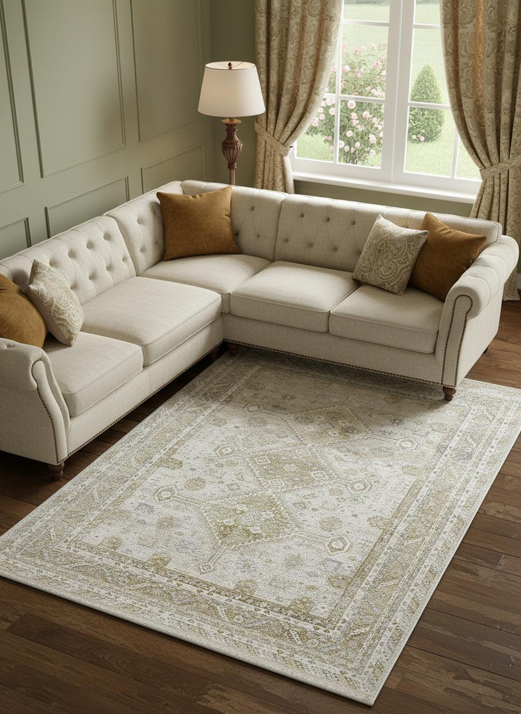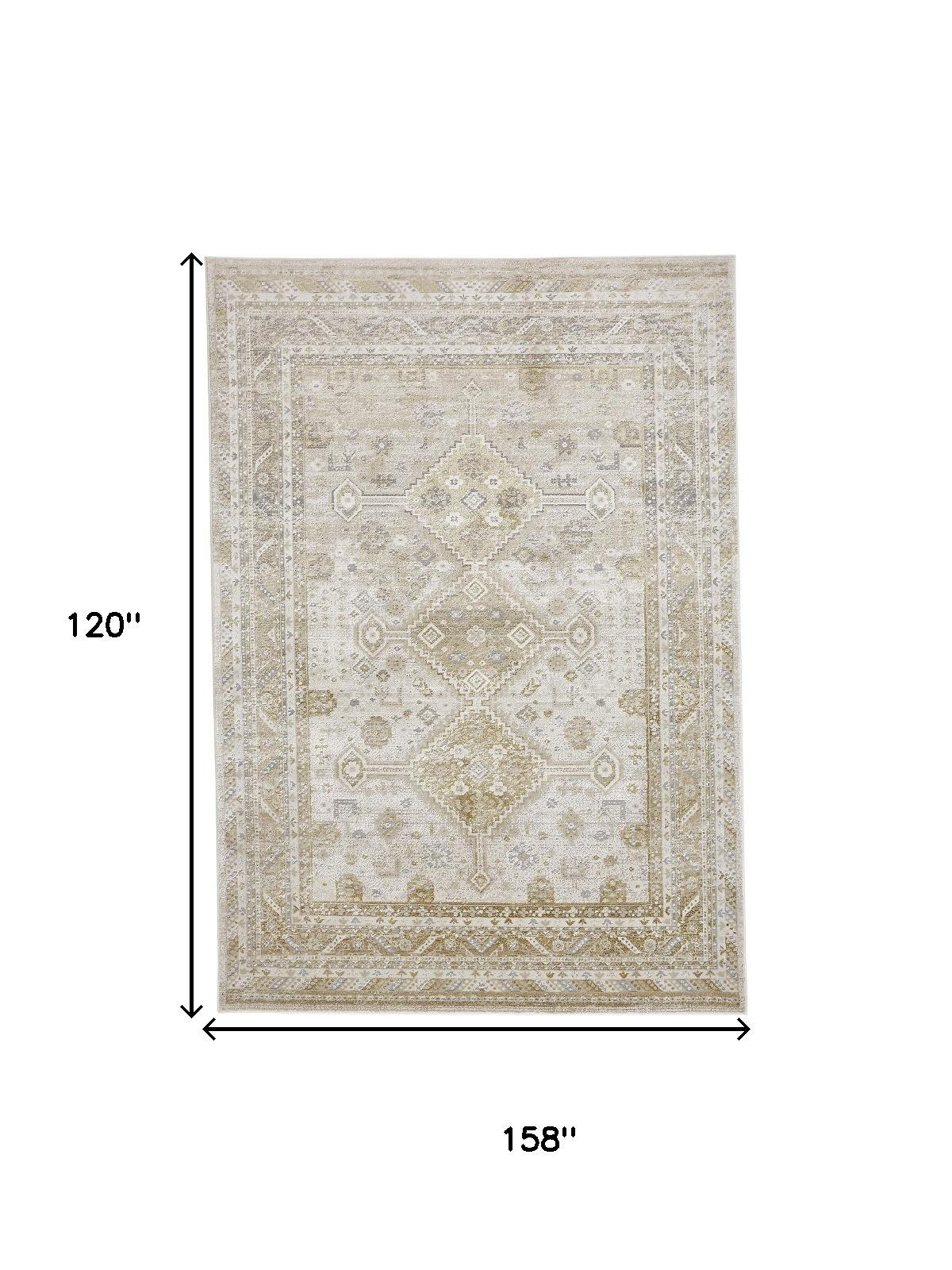 Set an inviting tone in your space with this 10' x 13' gold and ivory floral stain resistant area rug. This rectangle shaped rug features a floral design in gold and ivory to give it visual interest. A classic shape marries with good looking design for your space Made in Turkey, this rug offers high quality combined with good looking designer sensibilities. Ideal for spaces with kids and pets, this rug is stain resistant to help repel stains and spilled liquids. Place this area rug against a hardwood or tile floor and it will enliven your living space with style and sophistication. 0.39" H x 120" W x 158" D