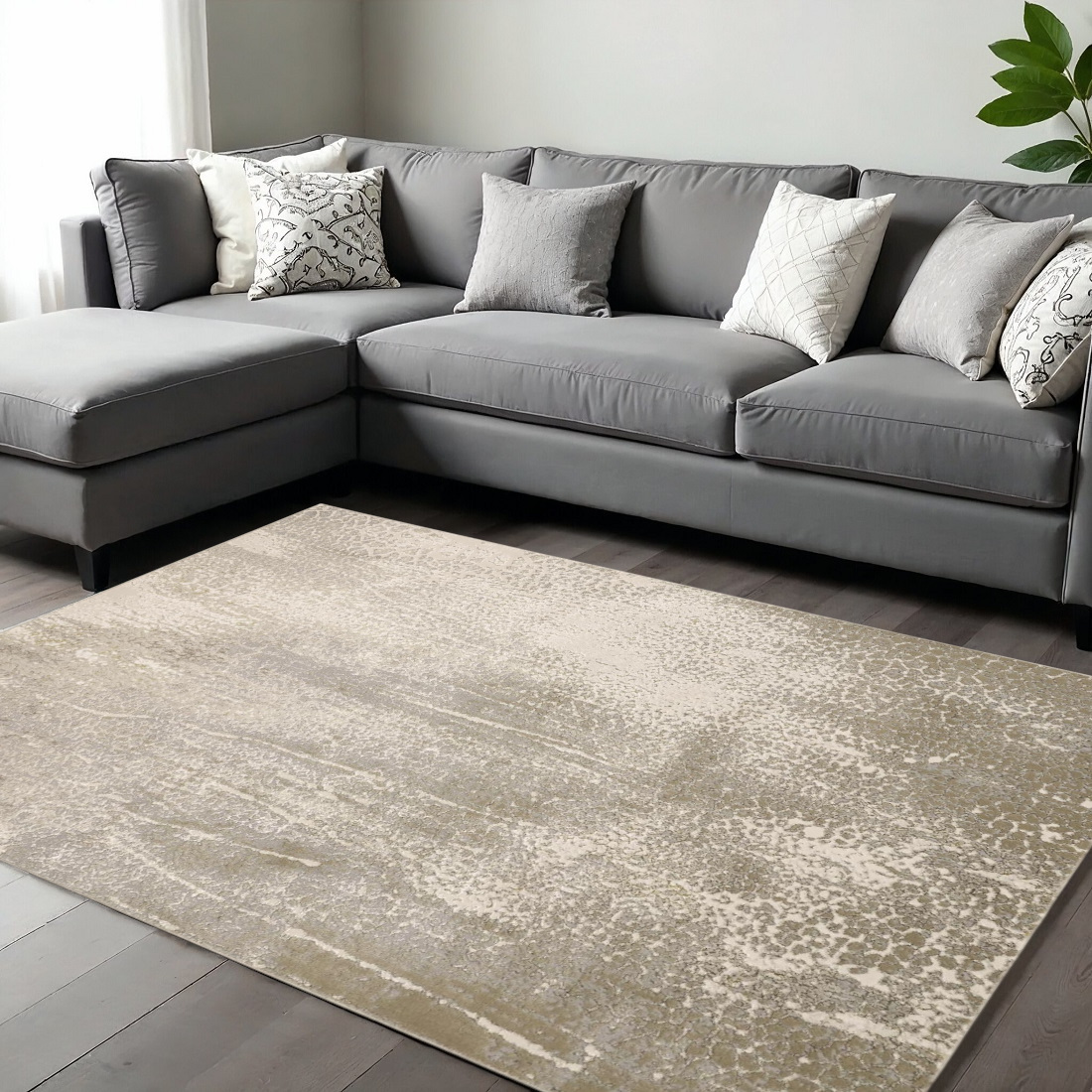 This 12-foot x 18-foot gold gray and ivory abstract area rug, is a great way to add warmth to a room. Built to last, this rug crafted from polyester fibers is known for its durability and long lasting appeal. Rugs are a great way to showcase your style, hide imperfections, warm your home and reduce noise. 144.00-inch h x 216.00-inch w x 0.39-inch d.