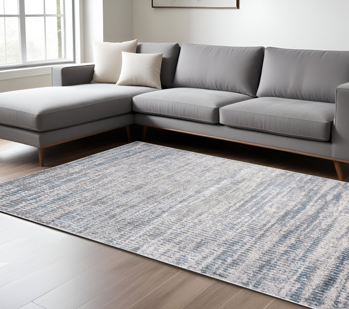 Add some artistry to your room with this 12-foot x 15-foot ivory gray and blue abstract area rug. Ideal for spaces with kids and pets, this rug is stain resistant to help repel dirt and spilled liquids. Built to last, this rug crafted from polyester fibers is known for its durability and long lasting appeal. Rugs are a great way to showcase your style, hide imperfections, warm your home and reduce noise. This larger sized, contemporary styled rug is ready to create a focal point or statement piece in your room. 144.00-inch h x 180.00-inch w x 0.39-inch d.