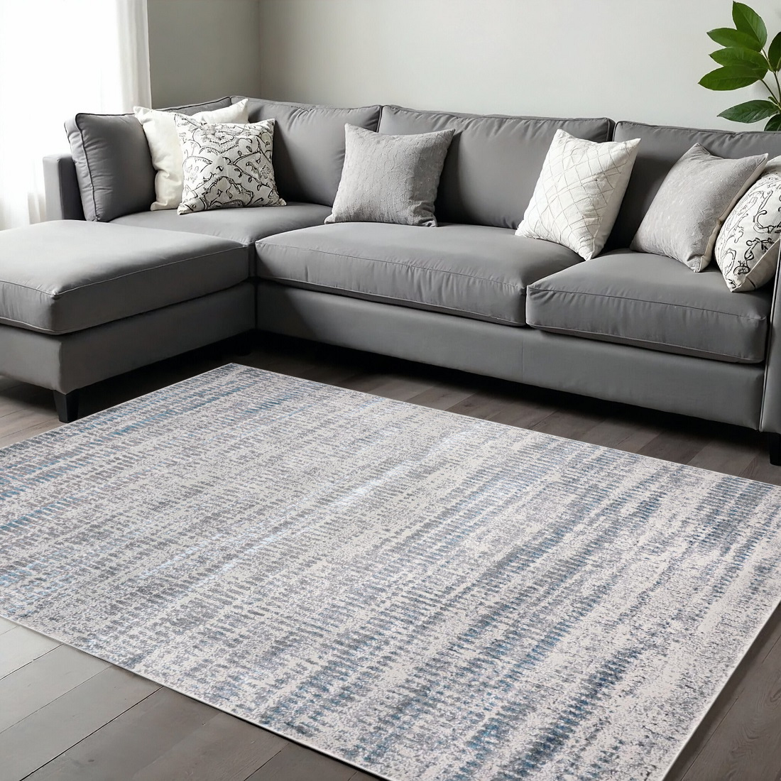 Add some artistry to your room with this 12-foot x 18-foot ivory gray and blue abstract area rug. Built to last, this rug crafted from polyester fibers is known for its durability and long lasting appeal. Rugs are a great way to showcase your style, hide imperfections, warm your home and reduce noise. 144.00-inch h x 216.00-inch w x 0.39-inch d.