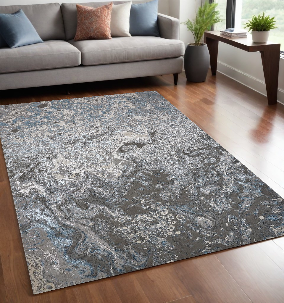 Add some artistry to your room with this 5-foot x 8-foot blue and gray abstract power loom area rug. This rectangle shaped rug features a abstract design that will add a functional and decorative accent to your space. Ideal for spaces with kids and pets, this rug is stain resistant to help repel dirt and spilled liquids. This larger sized rug is ideal to create a focal point or statement piece in your room. 60-inch h x 96-inch w x 0.39-inch d