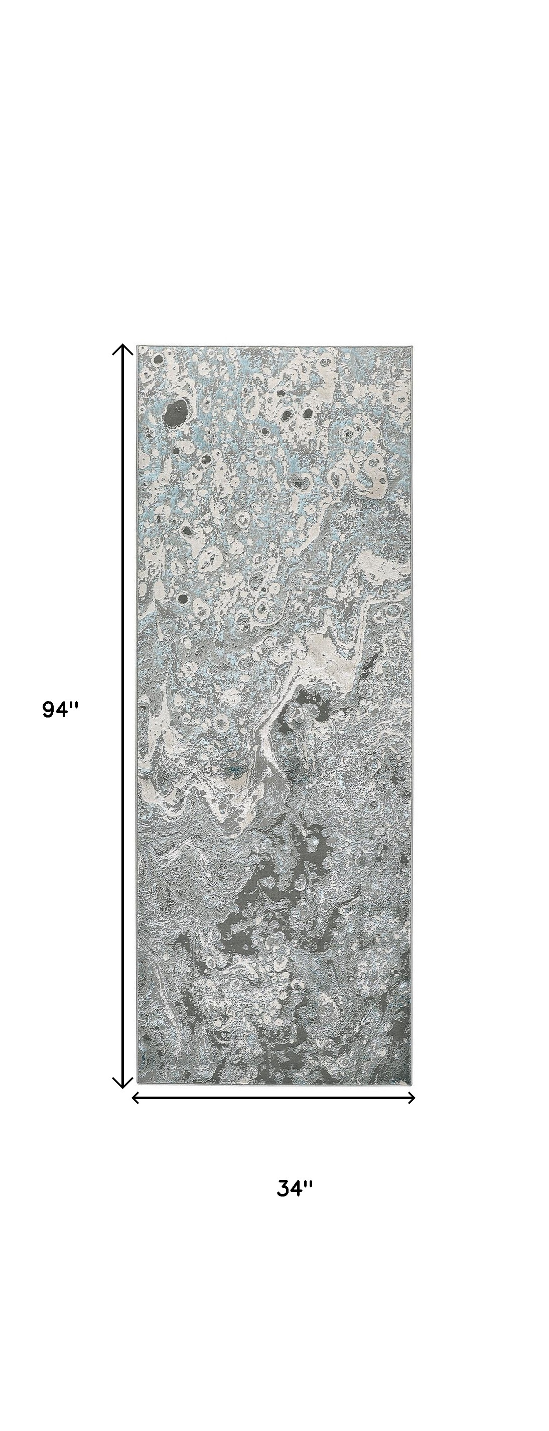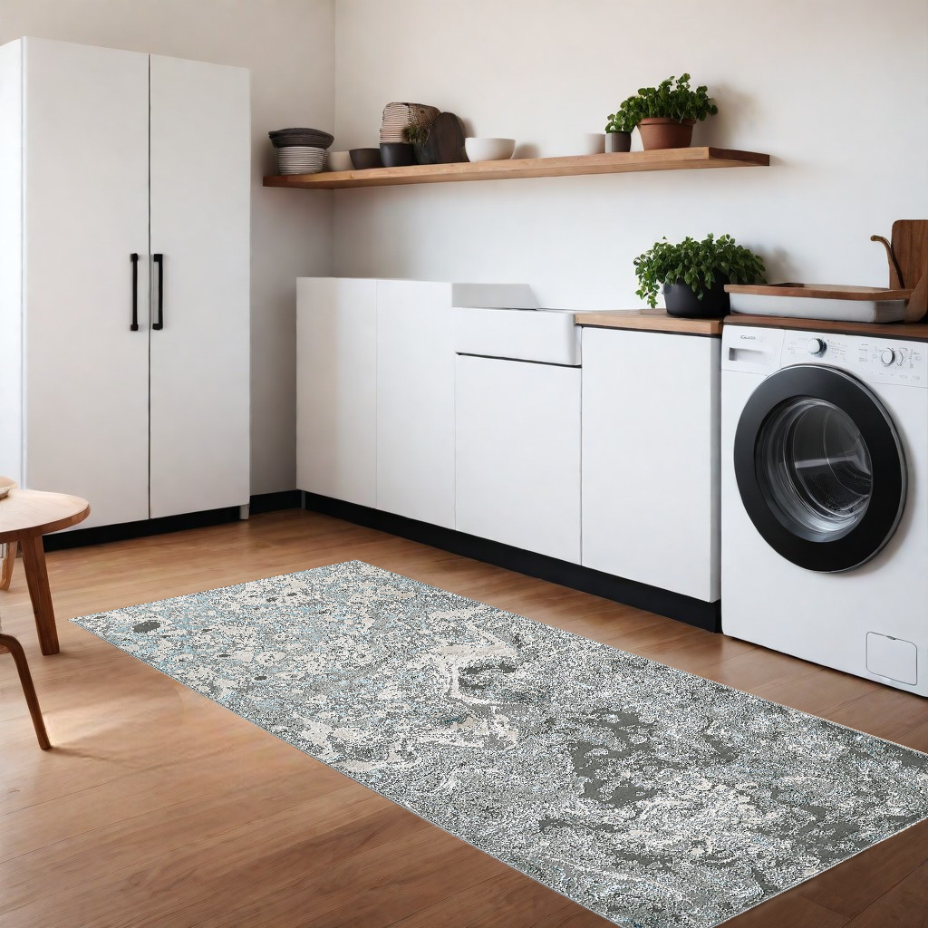 This 8-foot blue and gray abstract power loom runner rug, is a great way to add warmth to a room. This runner shaped rug features a abstract design that will add a functional and decorative accent to your space. Ideal for spaces with kids and pets, this rug is stain resistant to help repel dirt and spilled liquids. This smaller sized rug is just what you need for your walkway, or in front of door, cabinet, refrigerator, or chair. 34-inch h x 94-inch w x 0.39-inch d