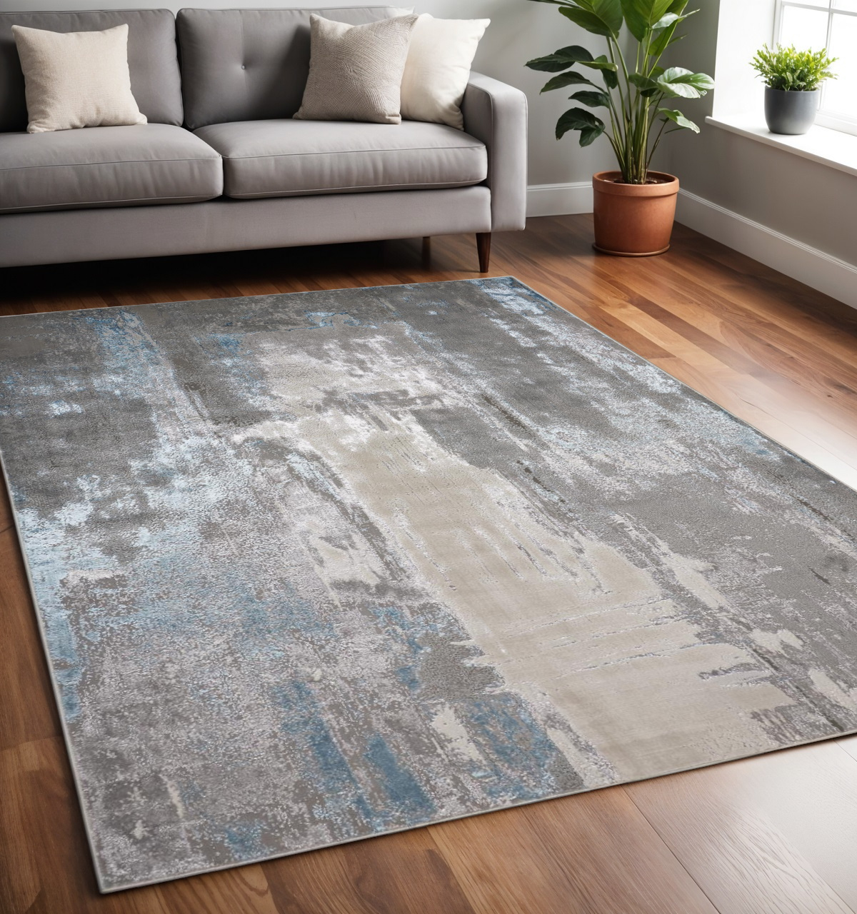 Set an inviting tone in your space with this 5-foot x 8-foot gray ivory and blue abstract area rug. Ideal for spaces with kids and pets, this rug is stain resistant to help repel dirt and spilled liquids. Built to last, this rug crafted from polyester fibers is known for its durability and long lasting appeal. Rugs are a great way to showcase your style, hide imperfections, warm your home and reduce noise. 60.00-inch h x 96.00-inch w x 0.39-inch d.
