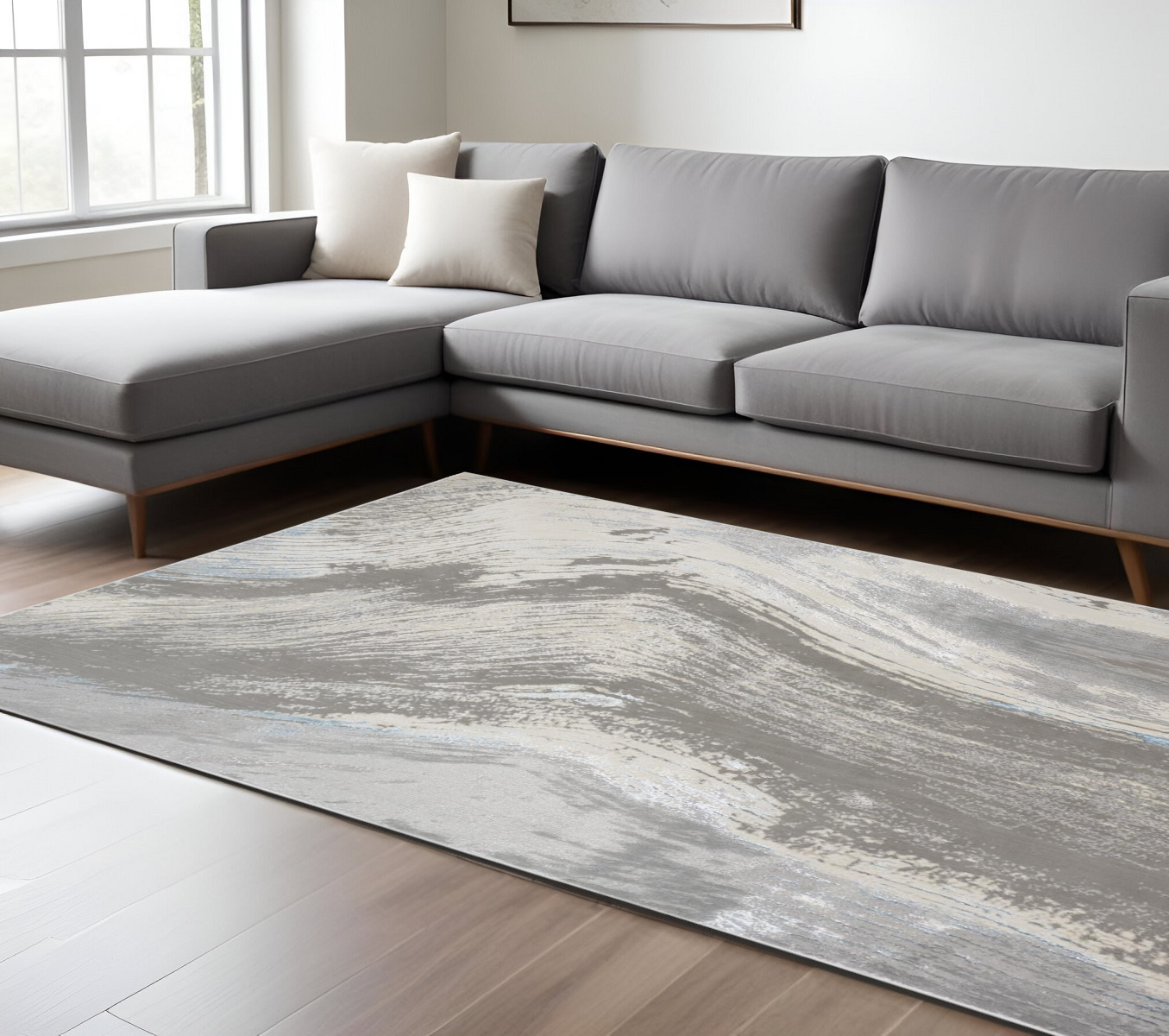 Add some artistry to your room with this 8-foot x 10-foot gray ivory and blue abstract non skid area rug. This rectangle shaped rug features a abstract design in gray ivory and blue to give it visual interest. A classic shape marries with good looking design for your space. 96-inch H x 120-inch W x 0.39-inch D
