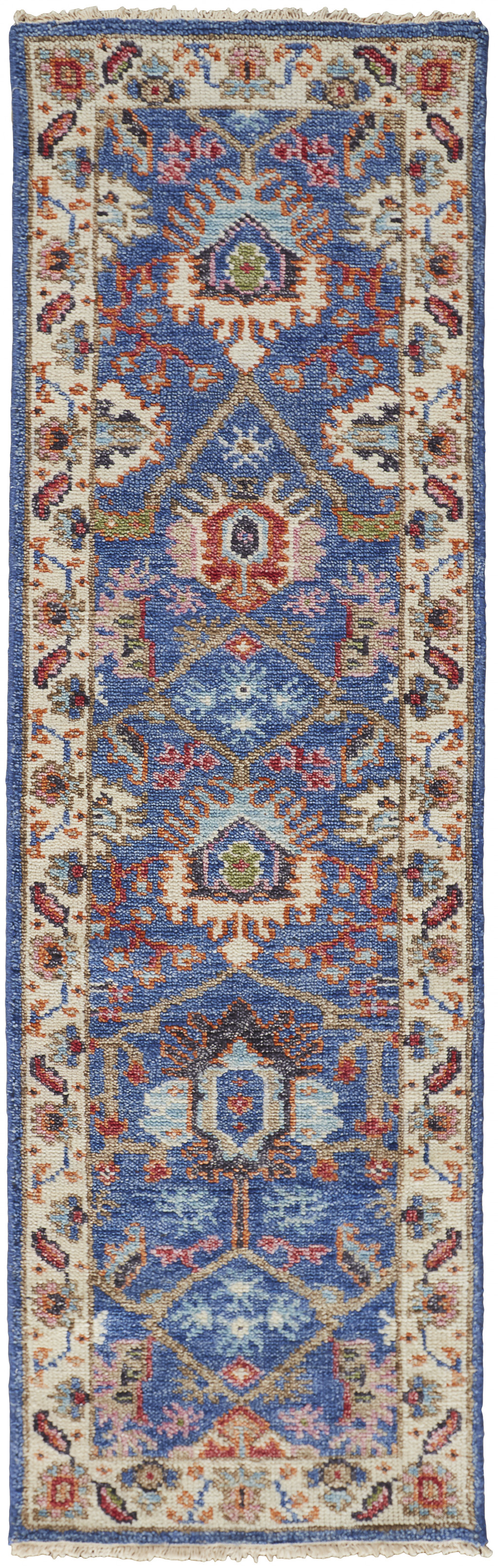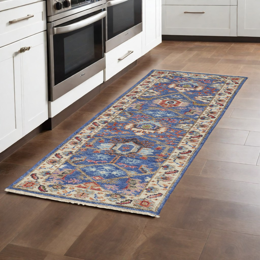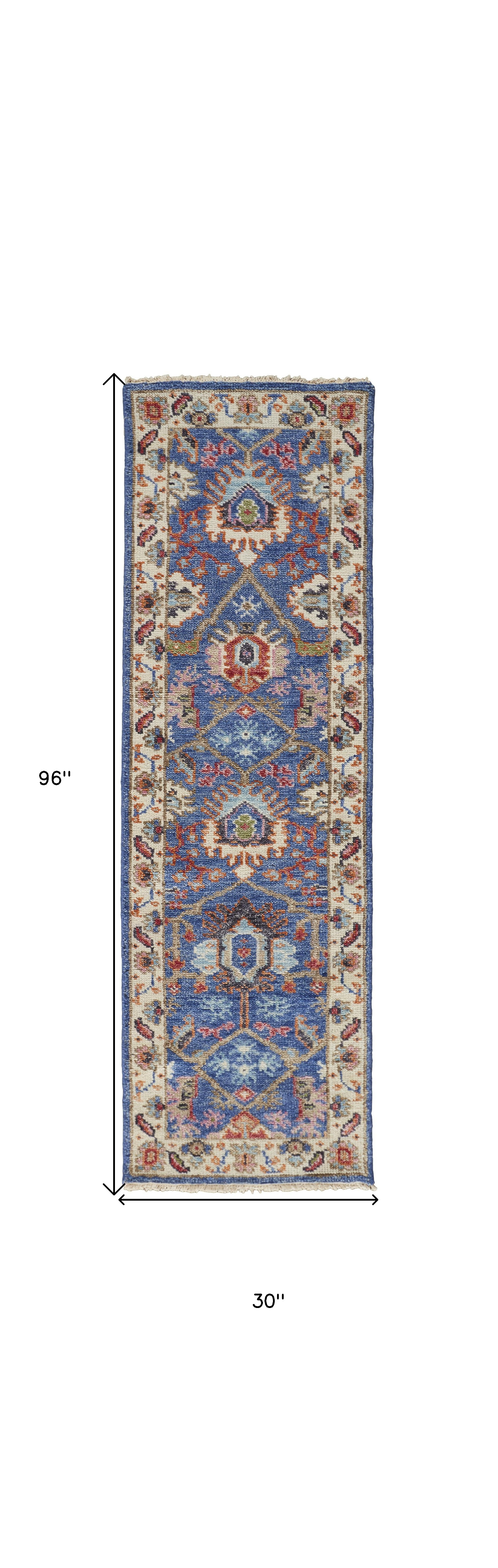 Add some artistry to your room with this 8-foot blue and beige wool floral hand knotted runner rug with fringe. Crafted by skilled artisans, this hand knotted rug is genuine and unique. No two will be exactly alike. This runner shaped rug features a floral design that will add a functional and decorative accent to your space. Ideal for spaces with kids and pets, this rug is stain resistant to help repel dirt and spilled liquids. Tassel ends bring a timeless and fashionable look to your interior. This smaller sized rug is just what you need for your walkway, or in front of door, cabinet, refrigerator, or chair. 30-inch h x 96-inch w x 0.28-inch d