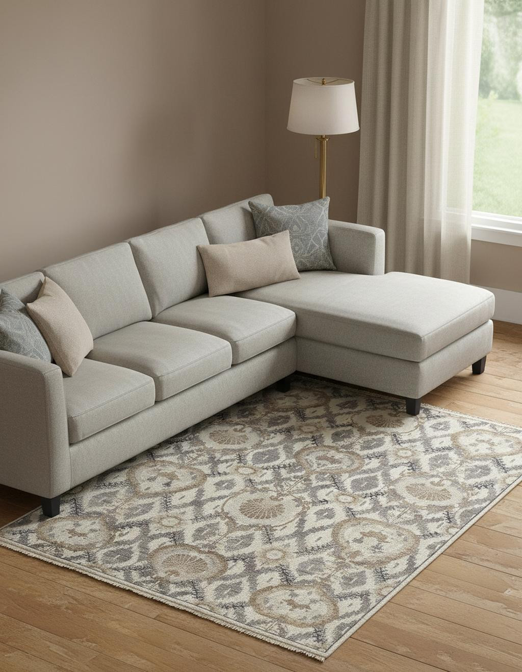 This 9' x 12' ivory gray and taupe wool floral hand knotted stain resistant area rug, is a great way to add warmth to a room. This rectangle shaped rug features a floral design in ivory gray and taupe to give it visual interest. A classic shape marries with good looking design for your space Ideal for spaces with kids and pets, this rug is stain resistant to help repel stains and spilled liquids. Crafted by skilled artisans, this hand knotted rug is genuine and unique. No two will be exactly alike. Area Rugs help to give warmth and sense of home to your space. 0.28" H x 102" W x 138" D