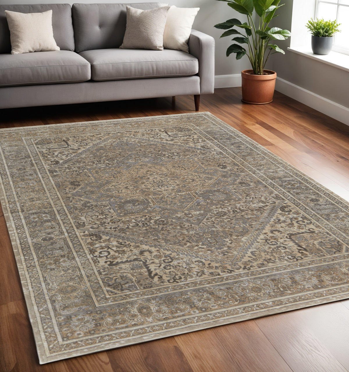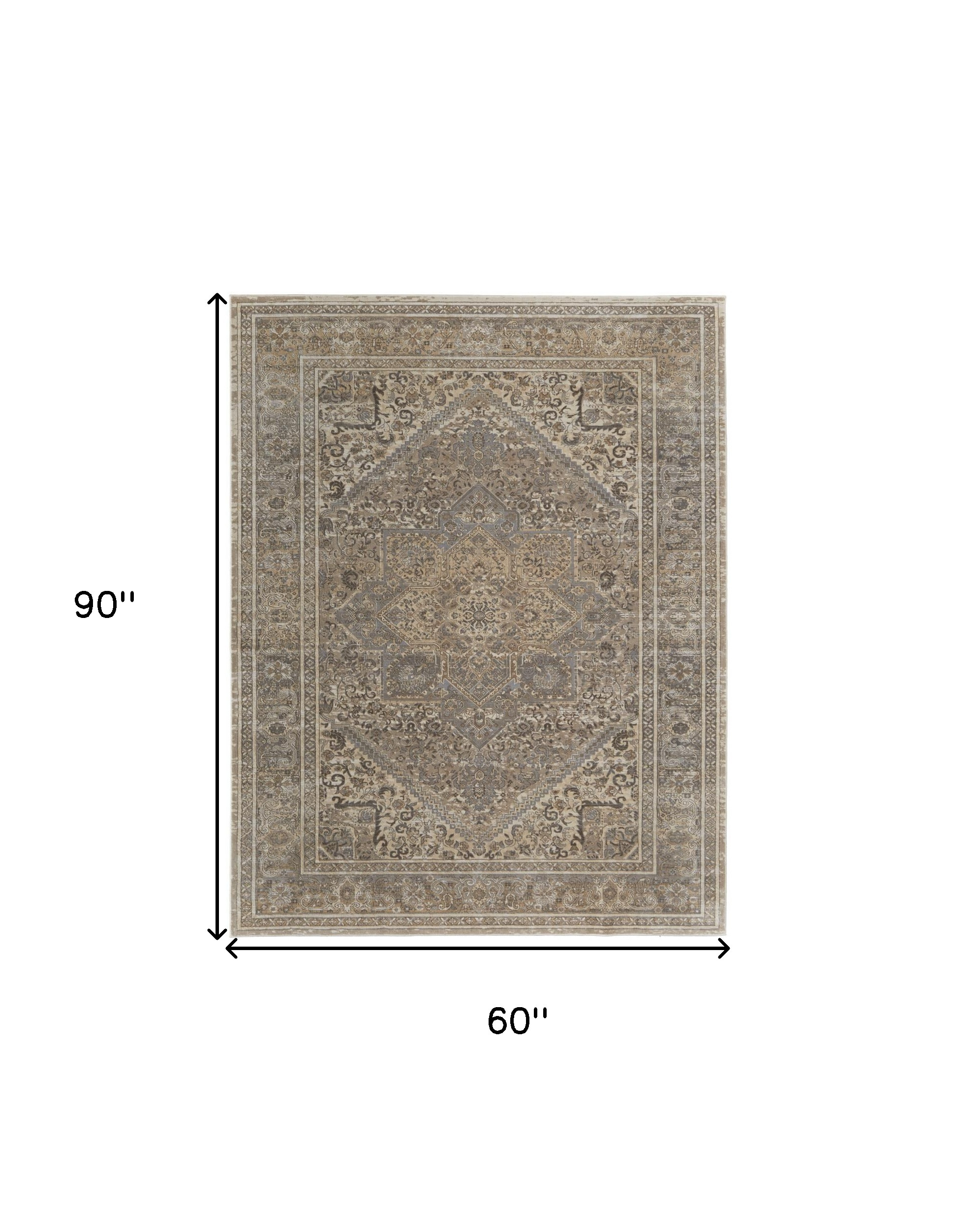 Add great coloration and comfortable texture to your space with this 5-foot x 8-foot tan brown and gray medallion distressed area rug. Rugs are a great way to showcase your style, hide imperfections, warm your home and reduce noise. Crafted with a machine-made construction for durability, this rug features a power loom technique that ensures a refined finish. The latex backing provides stability and helps keep the rug in place. Designed in a rectangular shape, it showcases a purposeful, worn faded distressing that adds character to any room while the viscose material offers a soft, luxurious feel underfoot. 60.00-inch h x 90.00-inch w x 0.39-inch d.