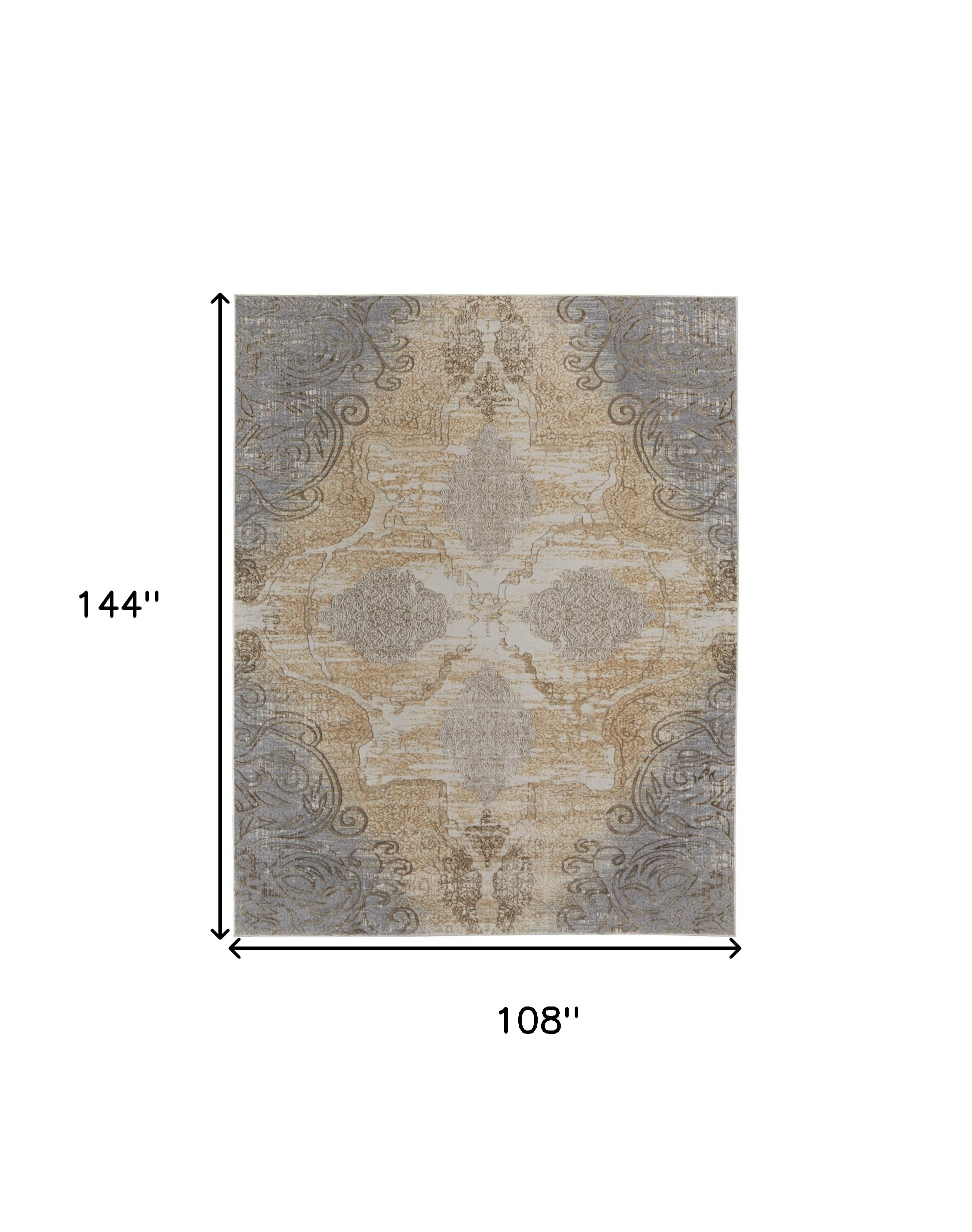 Add great coloration and comfortable texture to your space with this 9-foot x 12-foot tan and gray medallion area rug. This rug features a durable latex backing that ensures stability and longevity in any setting. Designed in a rectangle shape, it fits seamlessly into various room layouts, enhancing the overall aesthetic. Crafted using power loom technique, this machine-made rug offers intricate patterns and a soft feel underfoot. The viscose material adds a touch of elegance while providing comfort and warmth throughout your home. 108.00-inch h x 144.00-inch w x 0.39-inch d.