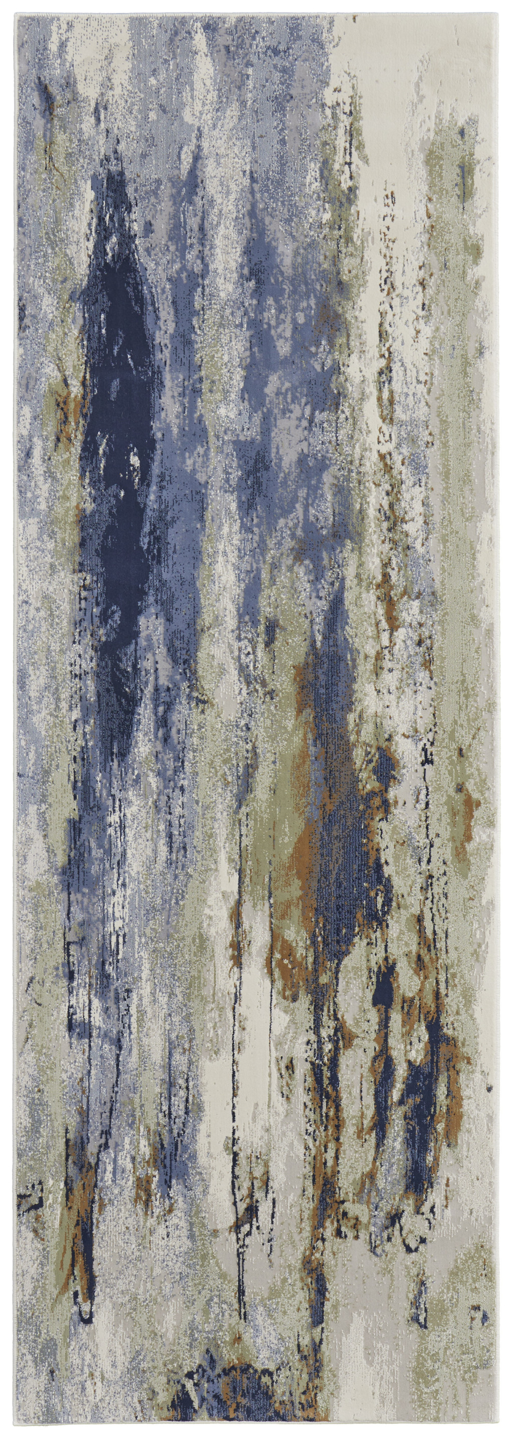 Set an inviting tone in your space with this 8' blue orange and ivory abstract power loom runner rug. This runner shaped rug features a abstract design in blue orange and ivory to give it visual interest. A classic shape marries with good looking design for your space This superior Turkish rug represents the highest quality and is built to last. Area Rugs help to give warmth and sense of home to your space. 0.39" H x 33" W x 94" D