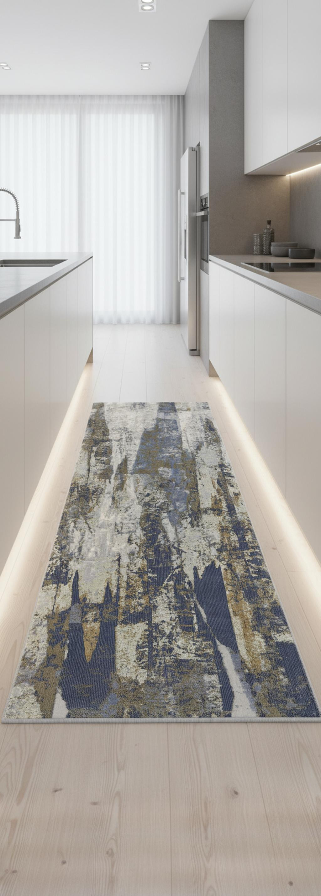 Add great coloration and comfortable texture to your space with this 8' blue gray and tan abstract power loom distressed runner rug. This runner shaped rug features a abstract design in blue gray and tan to give it visual interest. A classic shape marries with good looking design for your space Made in Turkey, this rug offers high quality combined with good looking designer sensibilities. Area Rugs help to give warmth and sense of home to your space. 0.39" H x 33" W x 94" D