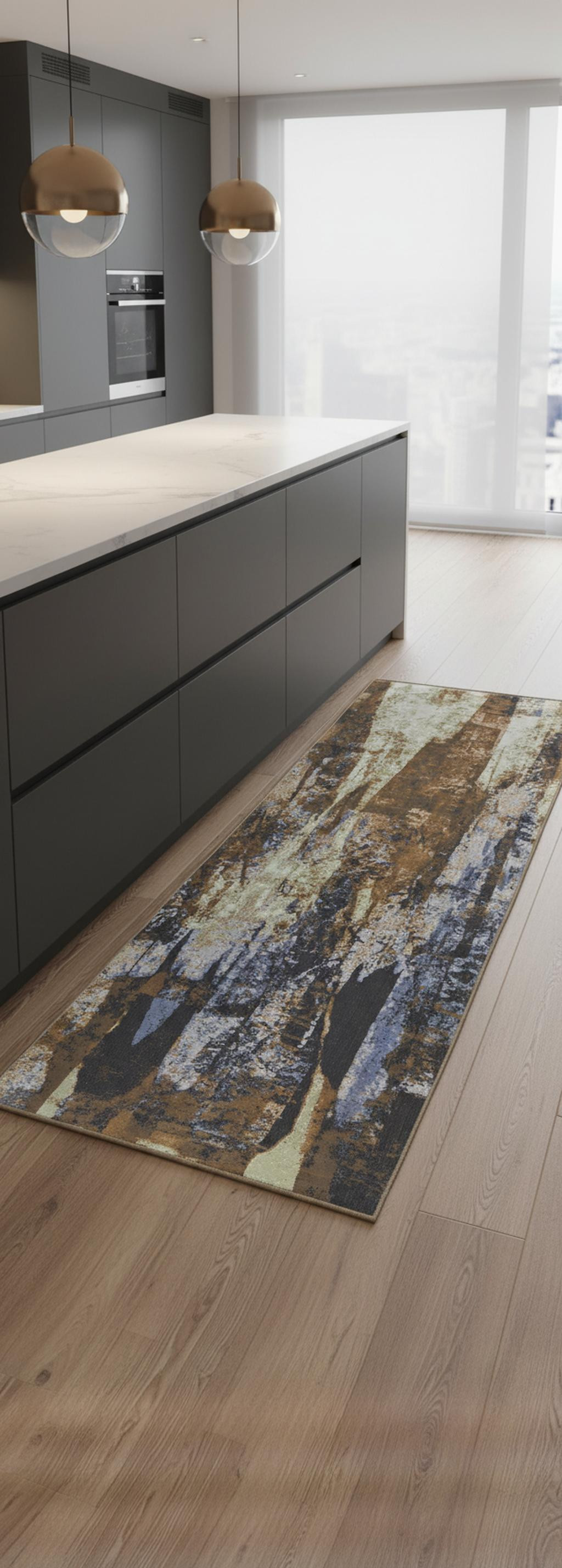 This 8' brown blue and ivory abstract power loom distressed runner rug, is a great way to add warmth to a room. This runner shaped rug features a abstract design in brown blue and ivory to give it visual interest. A classic shape marries with good looking design for your space Made in Turkey, this rug offers high quality combined with good looking designer sensibilities. Place this area rug against a hardwood or tile floor and it will enliven your living space with style and sophistication. 0.39" H x 33" W x 94" D