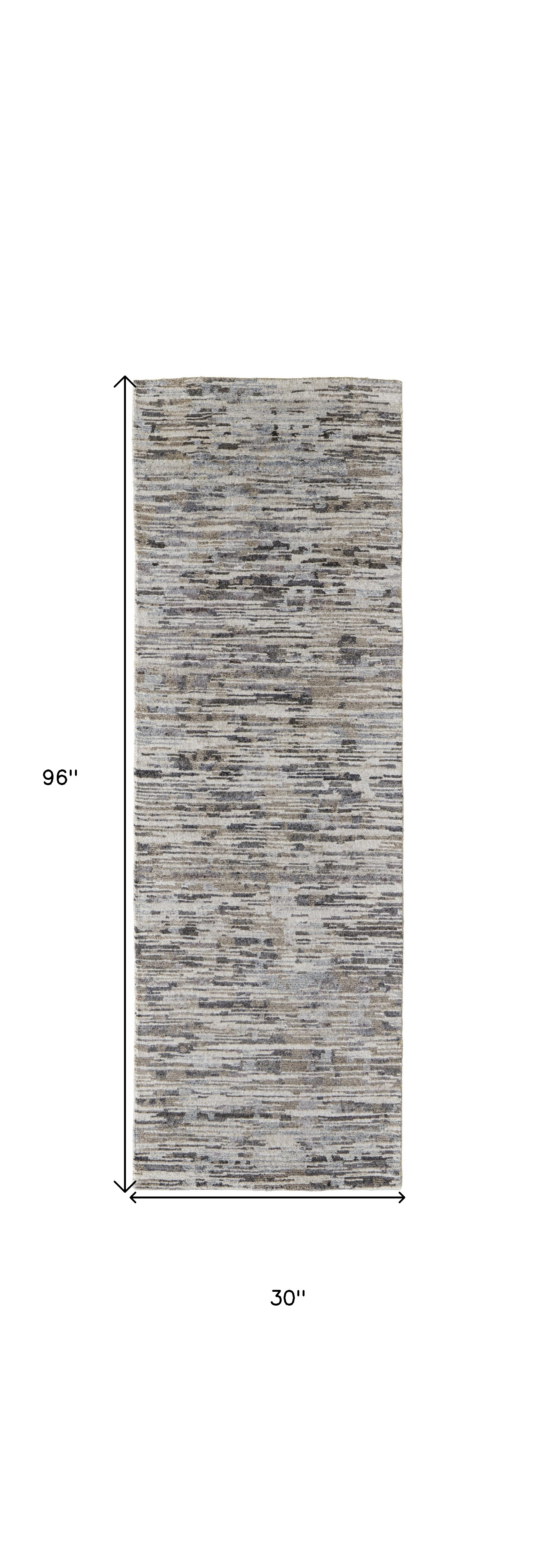 This 8-foot gray brown and beige wool abstract hand knotted runner rug, is a great way to add warmth to a room. Crafted by skilled artisans, this hand knotted rug is genuine and unique. No two will be exactly alike. Rugs are a great way to showcase your style, hide imperfections, warm your home and reduce noise. 30.00-inch h x 96.00-inch w x 0.39-inch d.