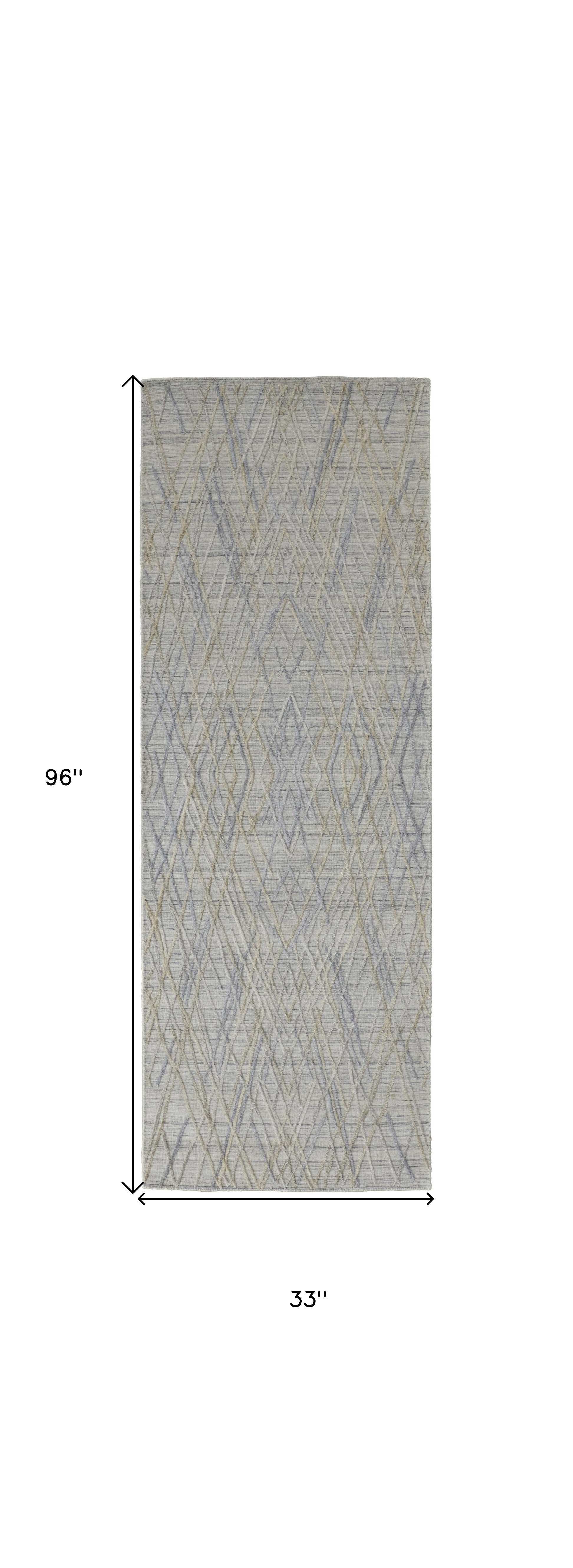 Add some artistry to your room with this 8' gray and ivory abstract hand woven runner rug. This runner shaped rug features a abstract design in gray and ivory to give it visual interest. A classic shape marries with good looking design for your space Crafted by skilled artisans, this hand woven rug is genuine and unique. No two will be exactly alike. Place this area rug against a hardwood or tile floor and it will enliven your living space with style and sophistication. 0.4" H x 33" W x 96" D