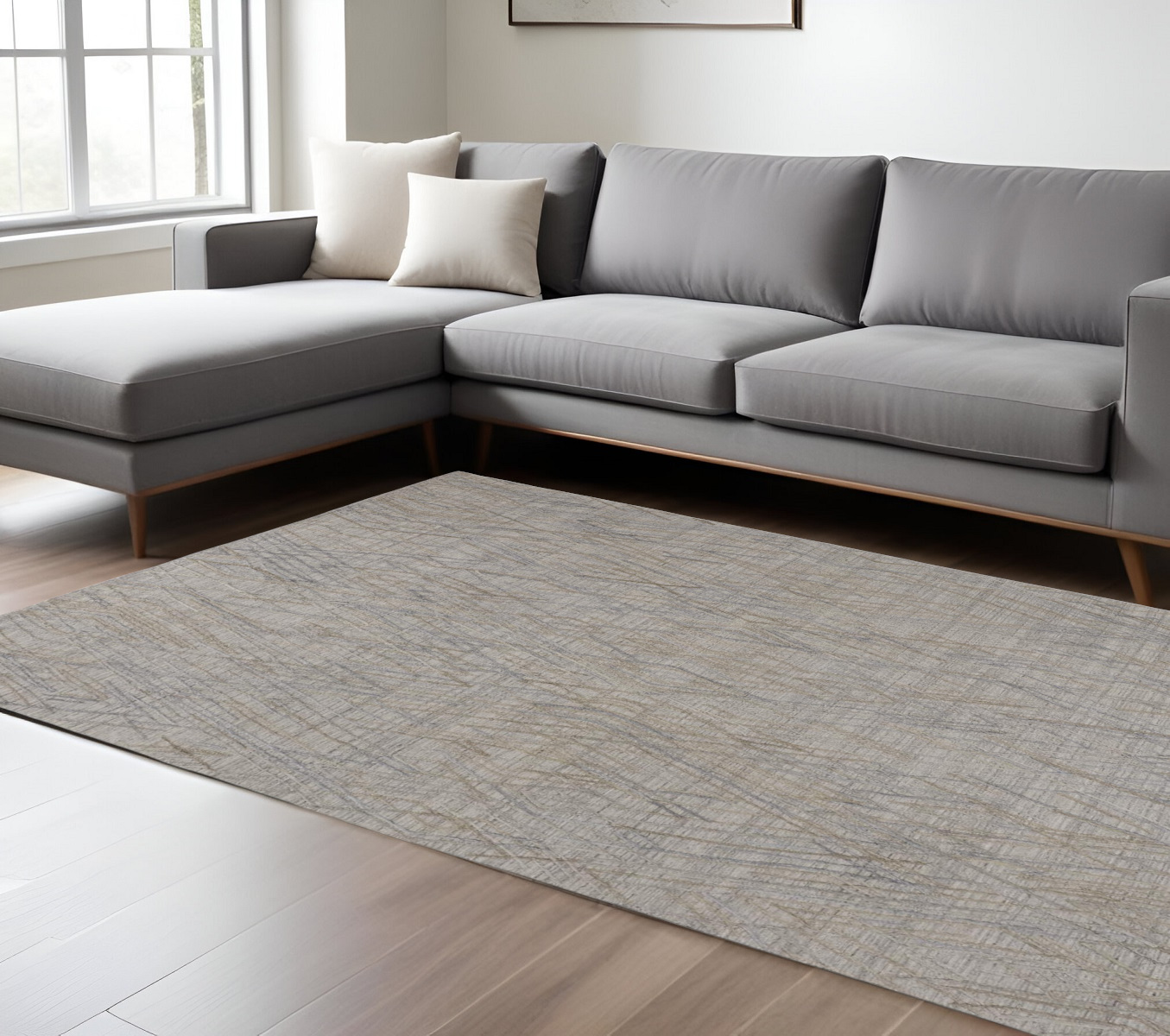 This 10' x 14' gray and blue abstract hand woven area rug, is a great way to add warmth to a room. This rectangle shaped rug features a abstract design in gray and blue to give it visual interest. A classic shape marries with good looking design for your space Crafted by skilled artisans, this hand woven rug is genuine and unique. No two will be exactly alike. Place this area rug against a hardwood or tile floor and it will enliven your living space with style and sophistication. 0.4" H x 120" W x 168" D