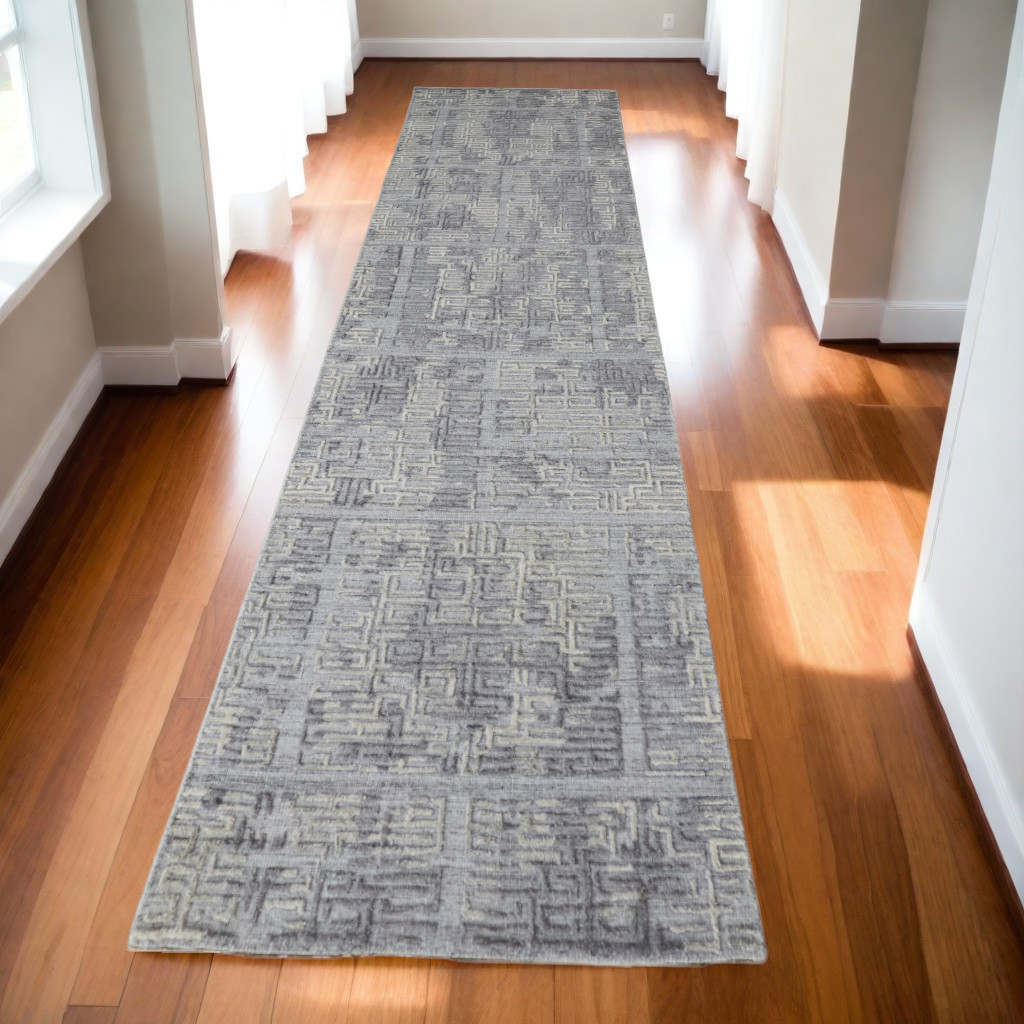 Add great coloration and comfortable texture to your space with this 10-foot gray and ivory abstract hand woven runner rug. This runner shaped rug features a abstract design in gray and ivory to give it visual interest. A classic shape marries with good looking design for your space crafted by skilled artisans, this hand woven rug is genuine and unique. No two will be exactly alike. 33-inch H x 120-inch W x 0.4-inch D
