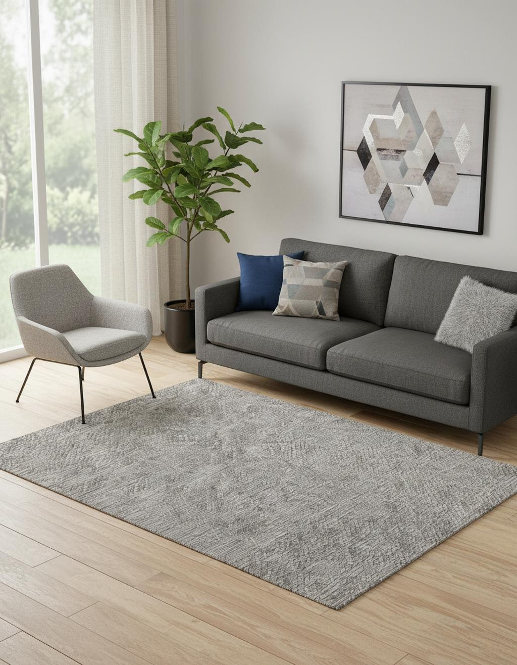 This 5' x 8' gray abstract hand woven area rug, is a great way to add warmth to a room. This rectangle shaped rug features a abstract design in gray to give it visual interest. A classic shape marries with good looking design for your space Crafted by skilled artisans, this hand woven rug is genuine and unique. No two will be exactly alike. Area Rugs help to give warmth and sense of home to your space. 0.4" H x 60" W x 96" D