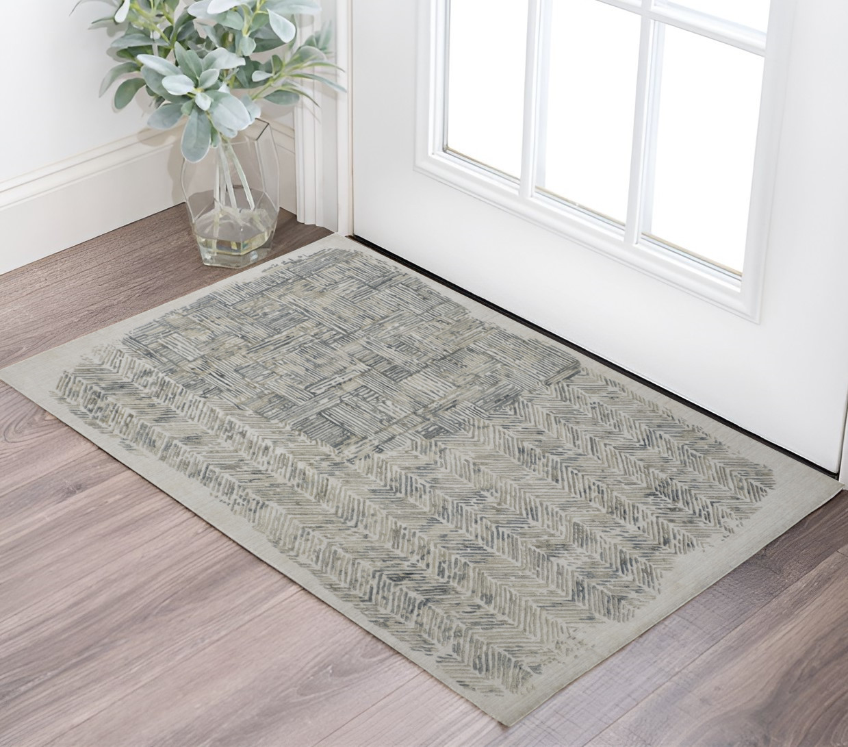 This 2' x 3' green blue and ivory abstract hand woven area rug, is a great way to add warmth to a room. This rectangle shaped rug features a abstract design in green blue and ivory to give it visual interest. A classic shape marries with good looking design for your space Crafted by skilled artisans, this hand woven rug is genuine and unique. No two will be exactly alike. Area Rugs help to give warmth and sense of home to your space. 0.4" H x 24" W x 36" D