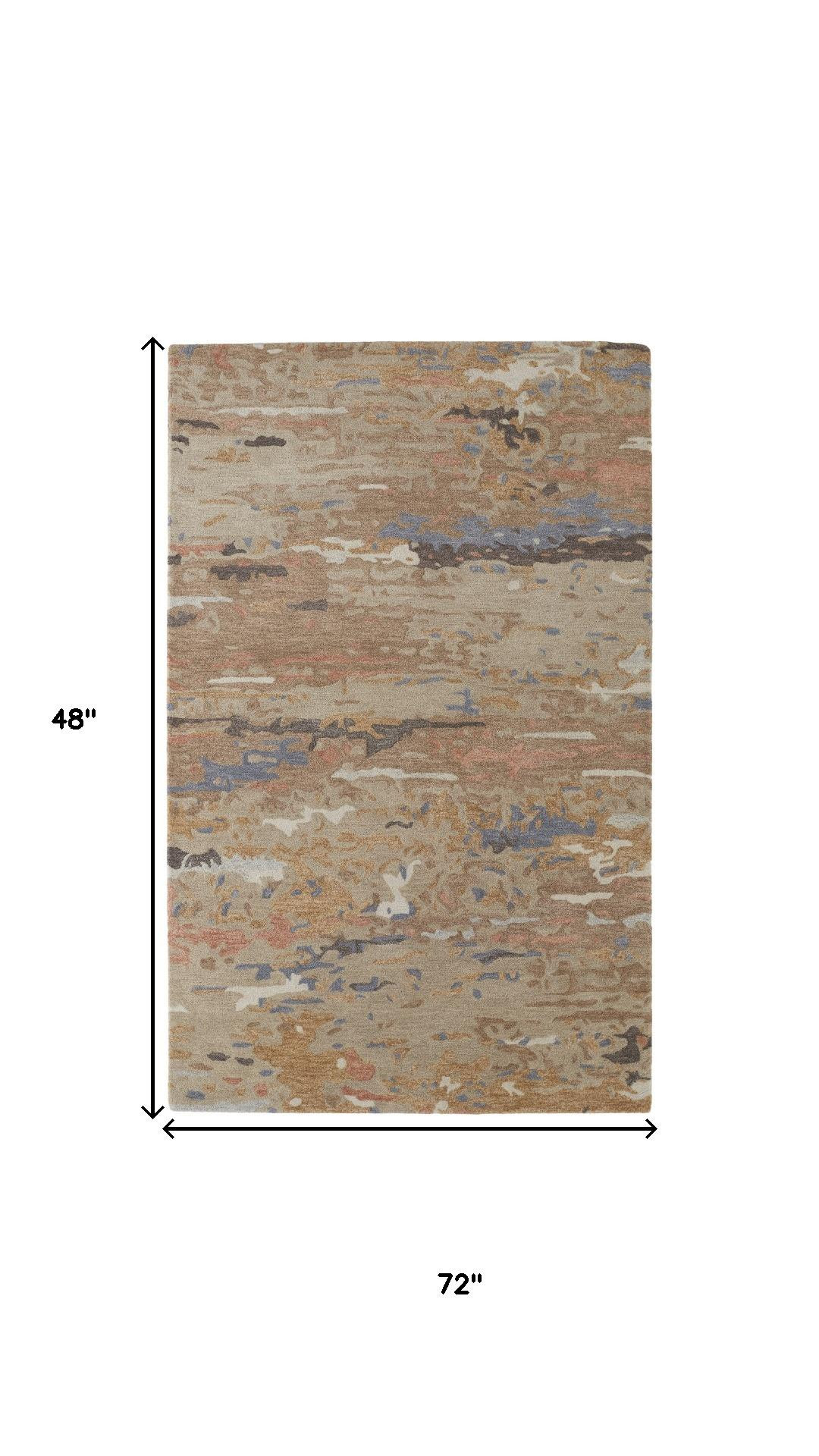 Add great coloration and comfortable texture to your space with this 4' x 6' tan and blue wool abstract tufted handmade stain resistant area rug. This rectangle shaped rug features a abstract design in tan and blue to give it visual interest. A classic shape marries with good looking design for your space Ideal for spaces with kids and pets, this rug is stain resistant to help repel stains and spilled liquids. Place this area rug against a hardwood or tile floor and it will enliven your living space with style and sophistication. 0.47" H x 48" W x 72" D