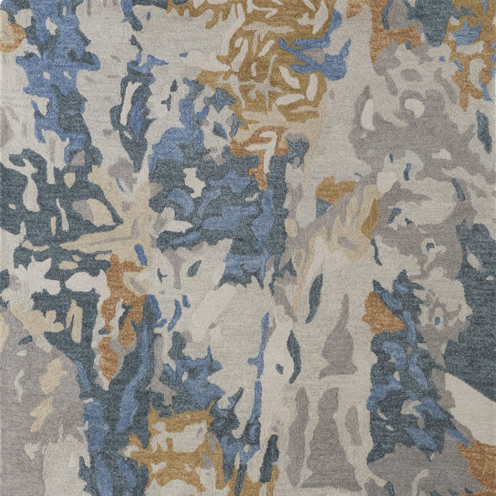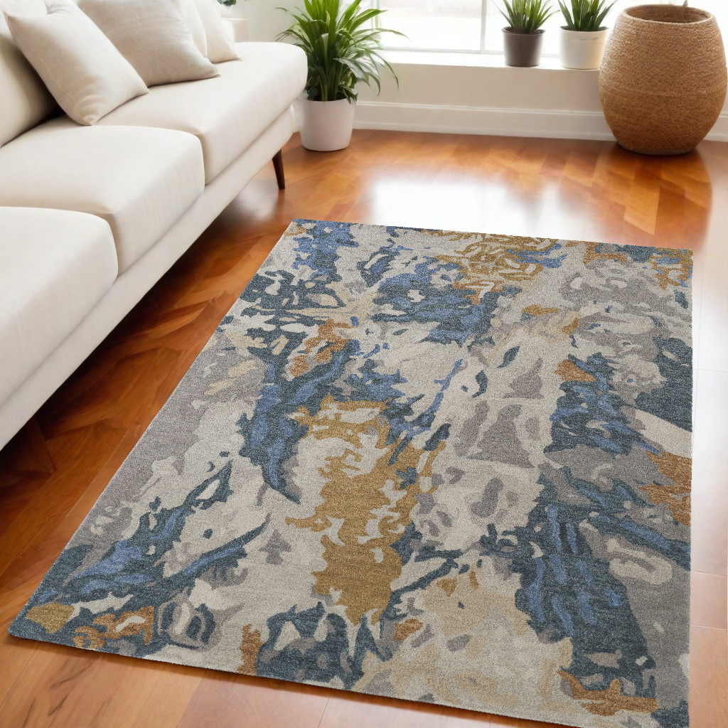 This 5-foot x 8-foot gray blue and gold wool abstract hand tufted area rug, is a great way to add warmth to a room. Ideal for spaces with kids and pets, this rug is stain resistant to help repel dirt and spilled liquids. Crafted by skilled artisans, this hand tufted rug is genuine and unique. No two will be exactly alike. Rugs are a great way to showcase your style, hide imperfections, warm your home and reduce noise. This larger sized, transitional styled rug is ready to create a focal point or statement piece in your room. 60.00-inch h x 96.00-inch w x 0.47-inch d.