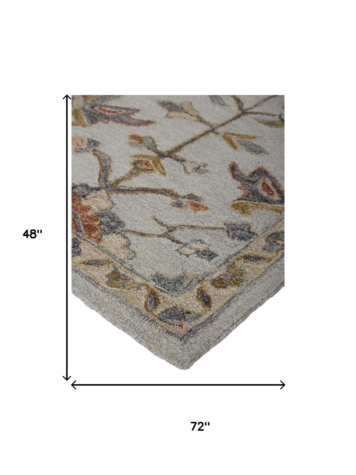 Add some artistry to your room with this 4' x 6' gray and gold wool floral tufted handmade stain resistant area rug. This rectangle shaped rug features a floral design in gray and gold to give it visual interest. A classic shape marries with good looking design for your space Ideal for spaces with kids and pets, this rug is stain resistant to help repel stains and spilled liquids. Place this area rug against a hardwood or tile floor and it will enliven your living space with style and sophistication. 0.37" H x 48" W x 72" D