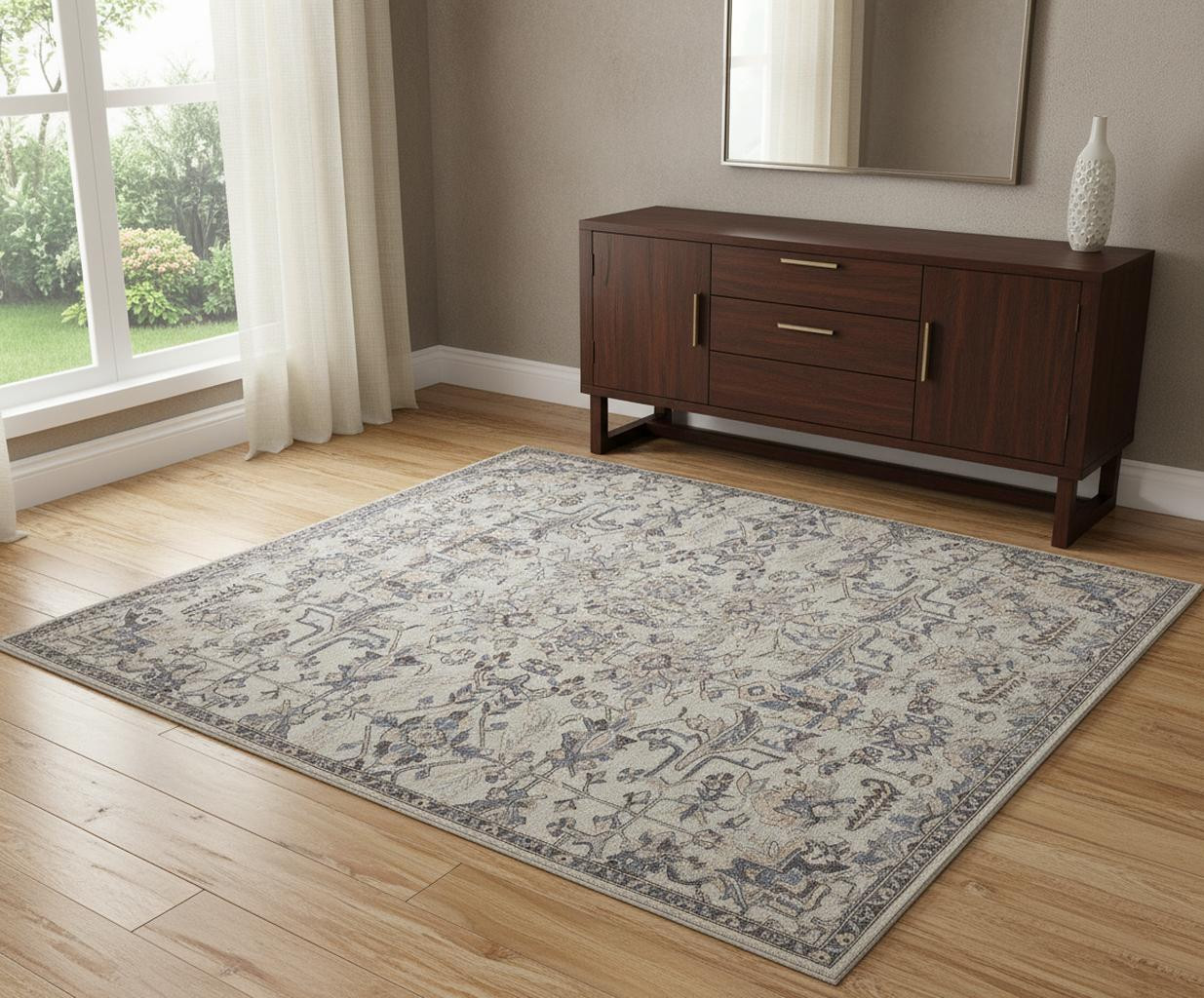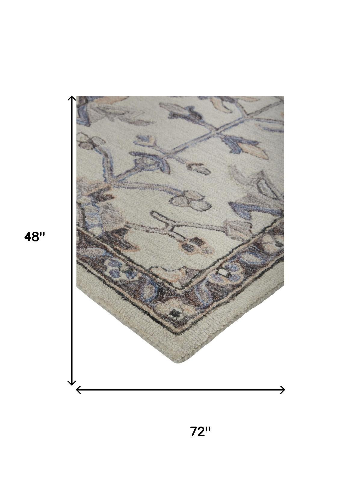 Set an inviting tone in your space with this 4' x 6' ivory and gray wool floral tufted handmade stain resistant area rug. This rectangle shaped rug features a floral design in ivory and gray to give it visual interest. A classic shape marries with good looking design for your space Ideal for spaces with kids and pets, this rug is stain resistant to help repel stains and spilled liquids. Area Rugs help to give warmth and sense of home to your space. 0.37" H x 48" W x 72" D