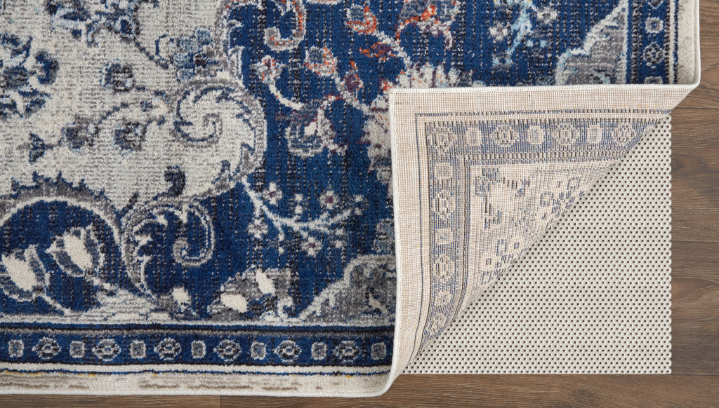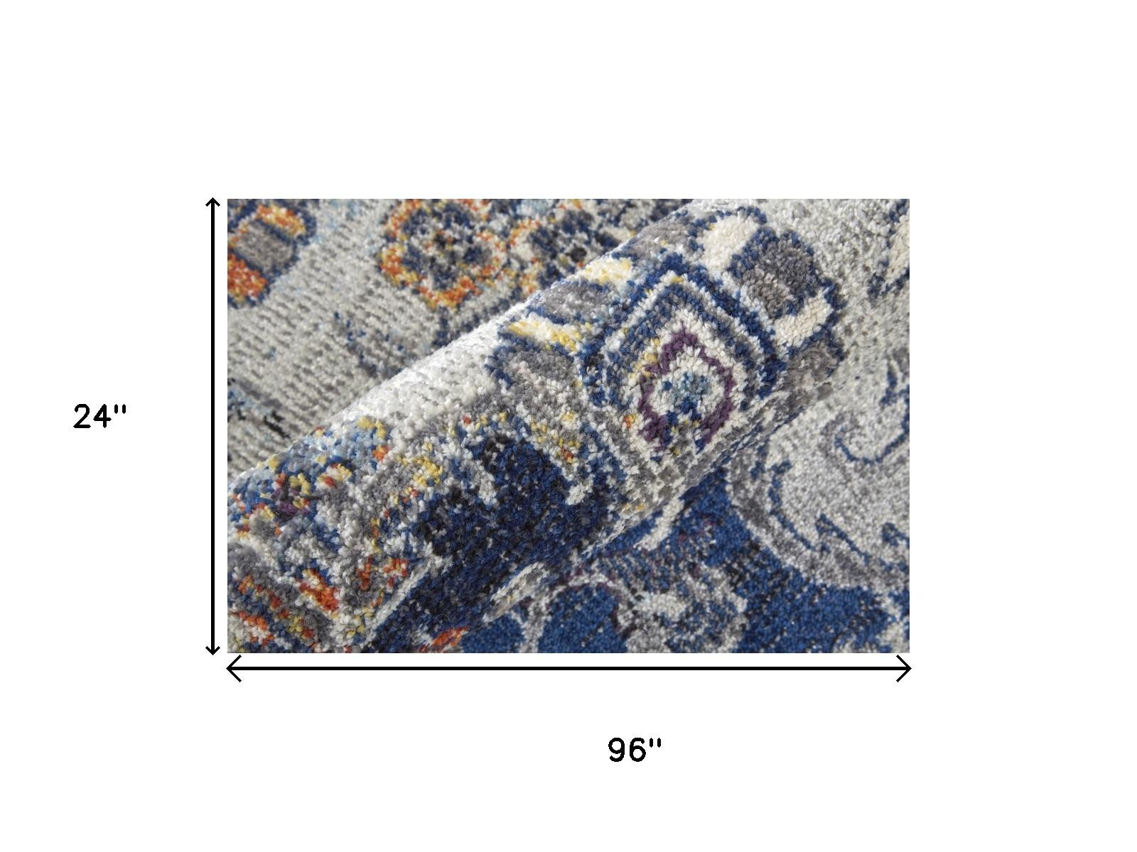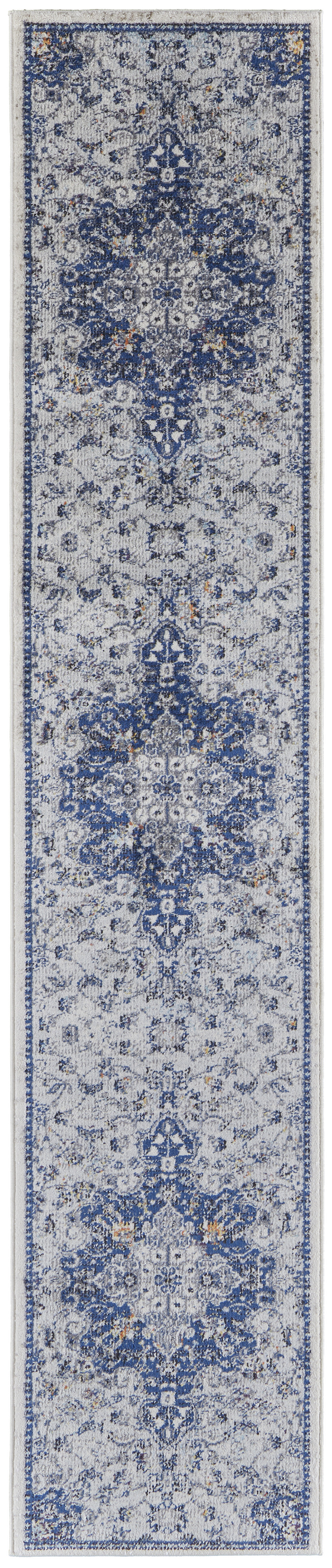 Set an inviting tone in your space with this 8' gray ivory and blue floral power loom distressed stain resistant runner rug. This runner shaped rug features a floral design in gray ivory and blue to give it visual interest. A classic shape marries with good looking design for your space This superior Turkish rug represents the highest quality and is built to last. Ideal for spaces with kids and pets, this rug is stain resistant to help repel stains and spilled liquids. Place this area rug against a hardwood or tile floor and it will enliven your living space with style and sophistication. 0.39" H x 24" W x 96" D